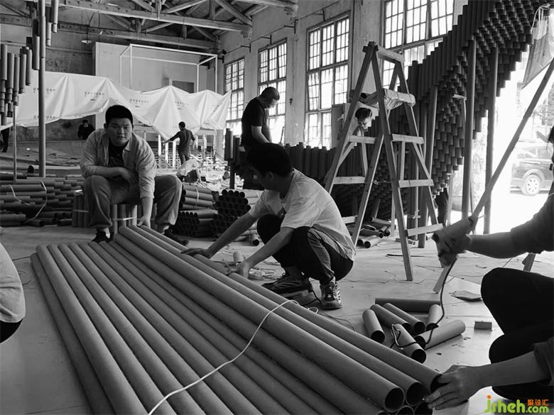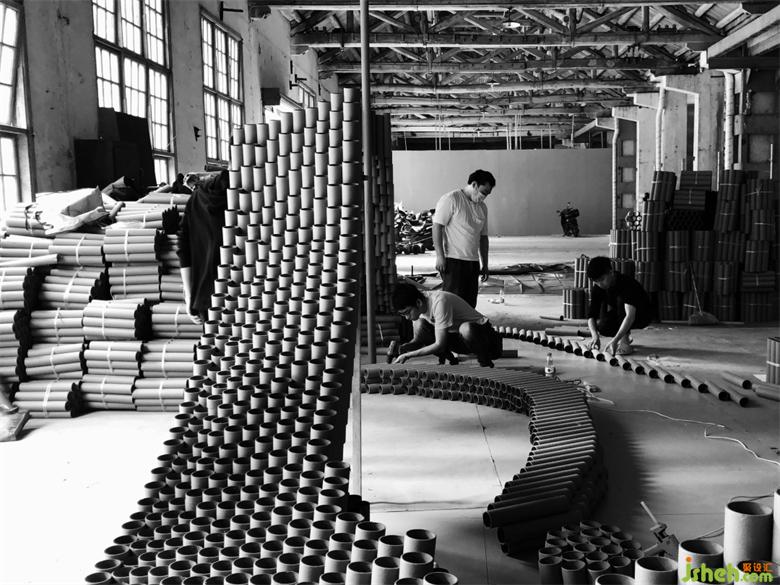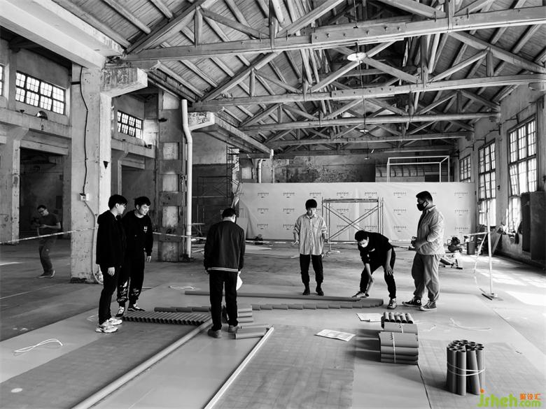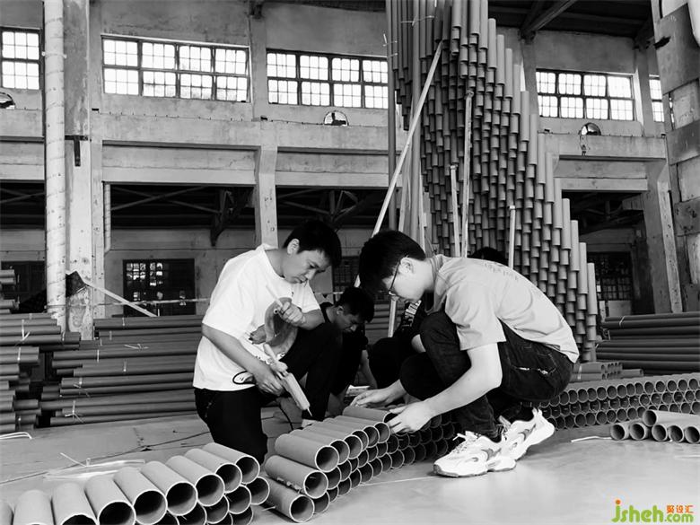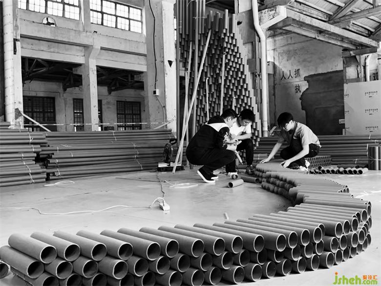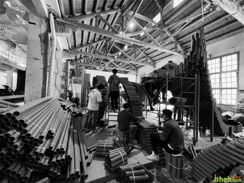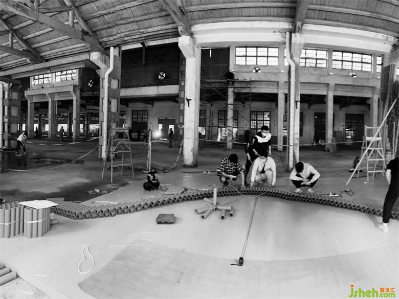 在搭建的第三天晚上,還遭遇了重慶史上難遇的9級(jí)大風(fēng),因?yàn)楝F(xiàn)場(chǎng)是廢舊的廠房,早已無(wú)完整的長(zhǎng)門和窗外做遮擋,作品的力學(xué)支撐也還未完全成型,前幾天搭建好的損壞了近三分之一。