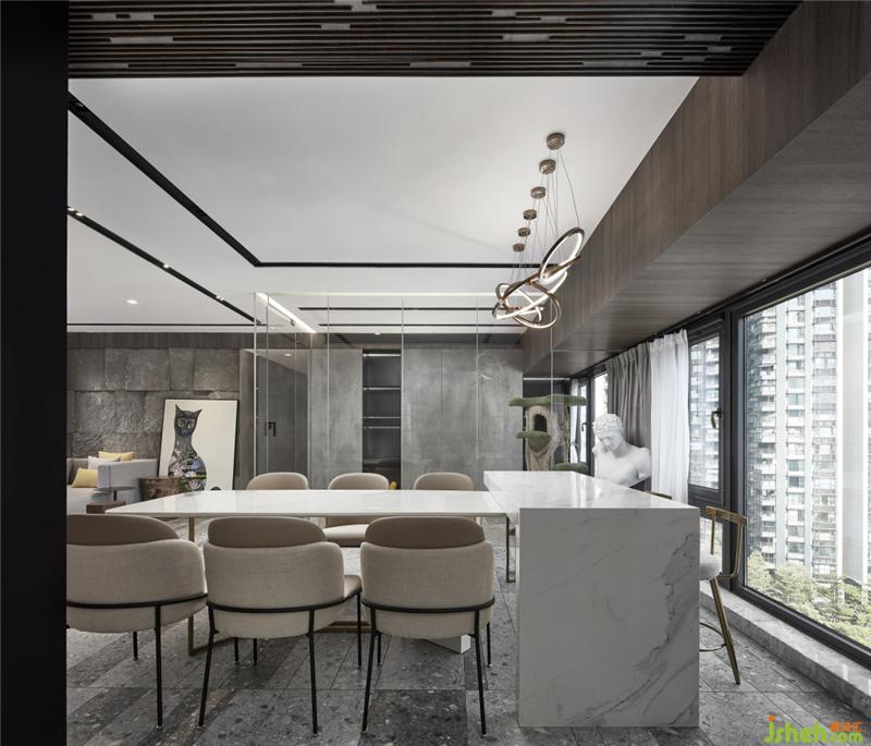 空間人文感知:設(shè)計(jì)師從本案重新探索玻璃、石、木等材料的有機(jī)結(jié)合,將崇尚自然復(fù)古的情緒融入進(jìn)空間,挖掘人文原始對(duì)自然材質(zhì)的心理感受。使現(xiàn)代空間更具原始、摩登氣質(zhì)。