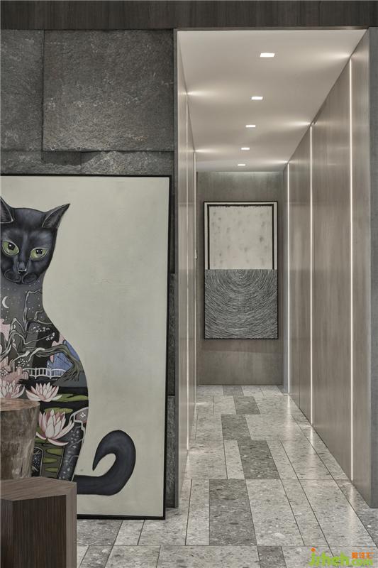 空間趣味感知:玄關(guān)木與玻璃矩形拼接的矩陣隔斷于入臥過(guò)道的矩形方塊拼接的機(jī)器人,他們之間是有形式結(jié)構(gòu)的趣味呼應(yīng),以及體現(xiàn)主人愛(ài)“貓”情節(jié)的大畫幅貓及貓的裝置品。形成軟裝配飾之間的相互呼應(yīng),展現(xiàn)了空間的趣味性。