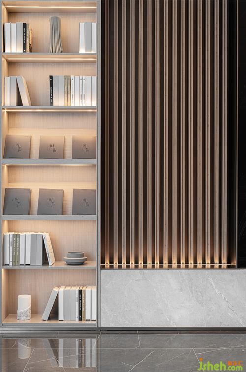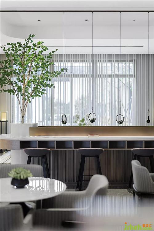 橫平豎直的線條擁有理性的、凝固的力量,大理石的接待臺(tái)與鑲嵌“時(shí)光”二字的隔斷墻體便是如此。連續(xù)的豎線隨綠意層層點(diǎn)染開(kāi)來(lái),表現(xiàn)山水畫(huà)的氤氳之美。