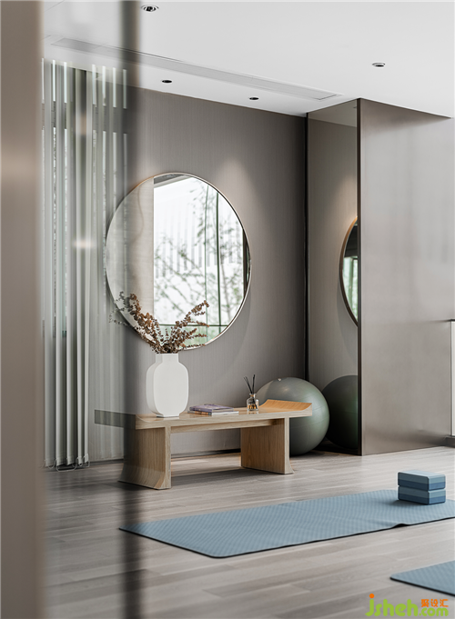 健身區(qū)占據(jù)東側(cè)開(kāi)間,臨窗的條件和高度優(yōu)勢(shì)使運(yùn)動(dòng)人士在揮灑汗水的同時(shí)也能保持著疏朗的心情。紅色的水滴藝術(shù)裝置既起到分隔的功能,也平衡了空間的色彩,使運(yùn)動(dòng)的瞬間更添熱力和動(dòng)感。