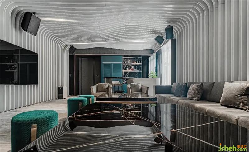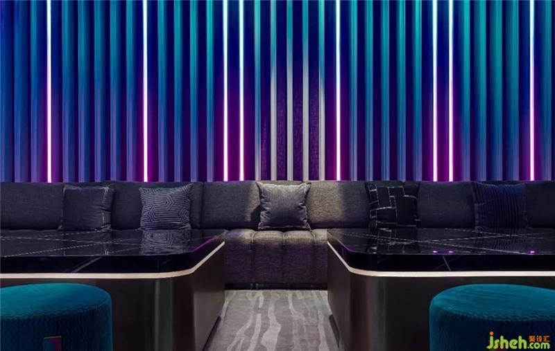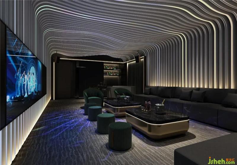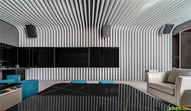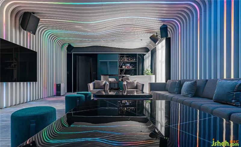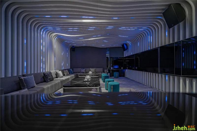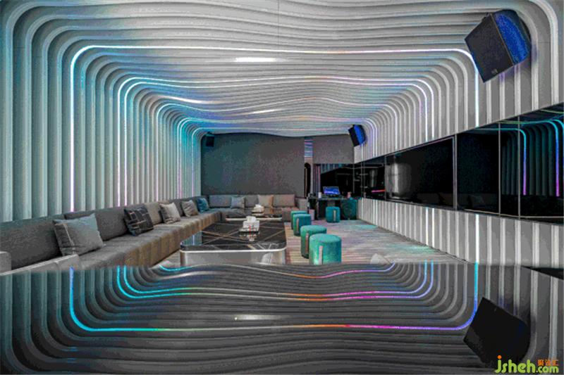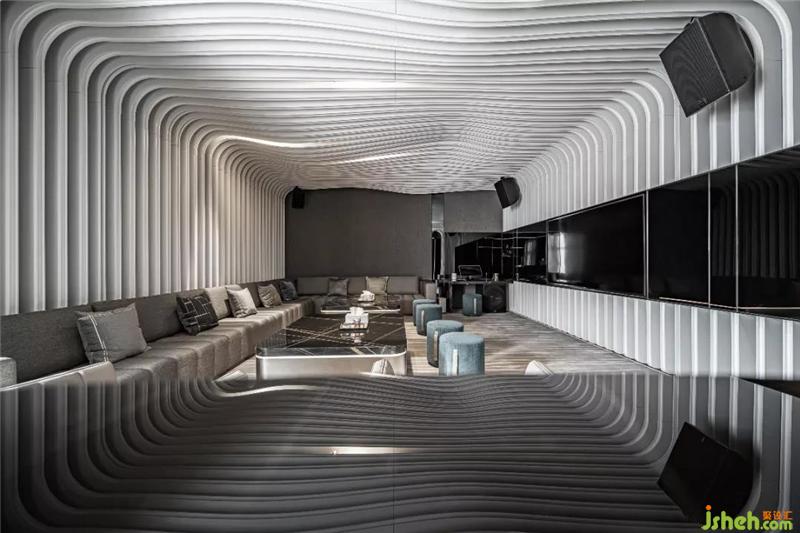 曲線屬于現(xiàn)代的表達,恣意而隨性。上層KTV套間經(jīng)過重新改造,以流暢的流線立意,展現(xiàn)出冷峻迷幻的氛圍。57根完全不同的曲線構(gòu)成的流線覆蓋整個KTV包廂的天花和墻體,如同波紋般款款地層層蕩漾開去,大膽創(chuàng)造極具沖擊的視覺張力,叫人眼前一亮。