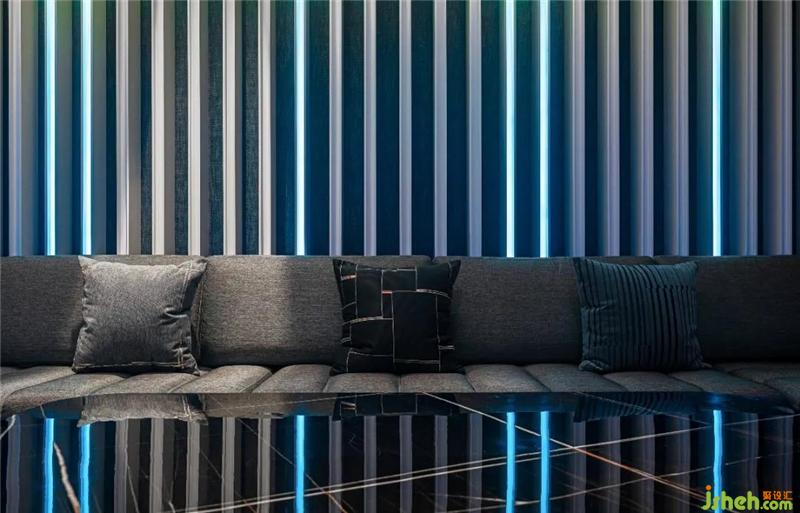 燈帶鑲嵌在曲線的格柵之中,隨著音樂動態(tài)幻變出千百種漸變色彩。南昌會所設(shè)計如夢似幻的光影陣列倒映在黑色大理石桌面上,恍惚間仿佛創(chuàng)造了象征著時尚、未來、迷離的“時空隧道”。
