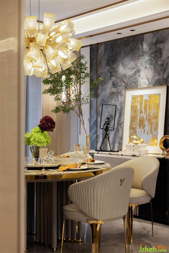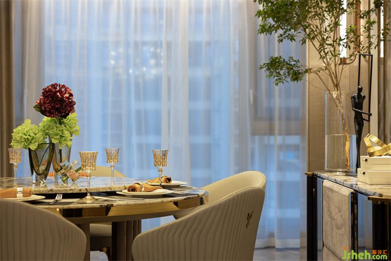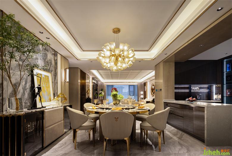 客餐廳之間保持開放無界式關(guān)係,大平層裝修設(shè)計(jì)以圓形餐桌為餐廳核心,營造融洽的家庭氛圍。