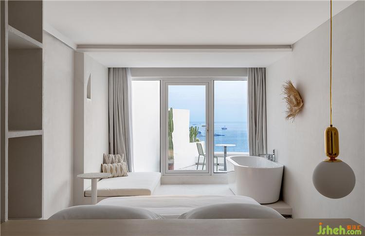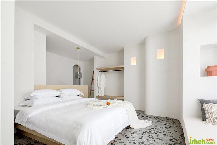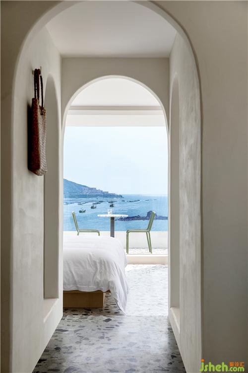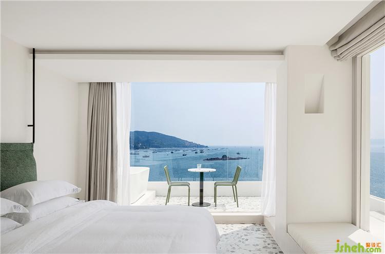 空間最大限度地將室外風(fēng)景引入室內(nèi),客房的每扇窗戶都被精心安排,朝向最美的視角開設(shè),為來客細(xì)細(xì)收集這里的每一刻光景。透過細(xì)框落地窗遠(yuǎn)眺出去,清藍(lán)的海與山成了一幅框景,日出的璨斕、海浪的長歌、晚霞的溫柔……空間將流動而纏綿的自然詩意納入日常之中,予人安適舒愜之感。酒店設(shè)計