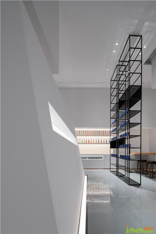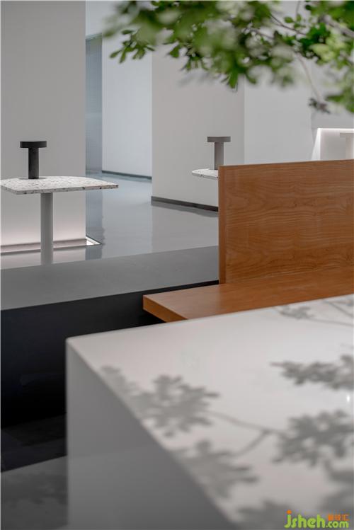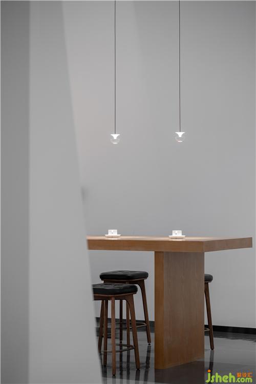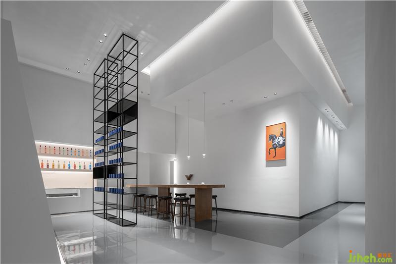 層高3.8米的線條感隔柵與垂直投射的陣列型吊燈相互映襯,演繹出摩登的當(dāng)代設(shè)計(jì)美學(xué)。深度洽談區(qū)的長(zhǎng)桌延伸至吧臺(tái)展示柜,體塊的交疊穿插塑造著獨(dú)特的雕塑感與戲劇趣味。