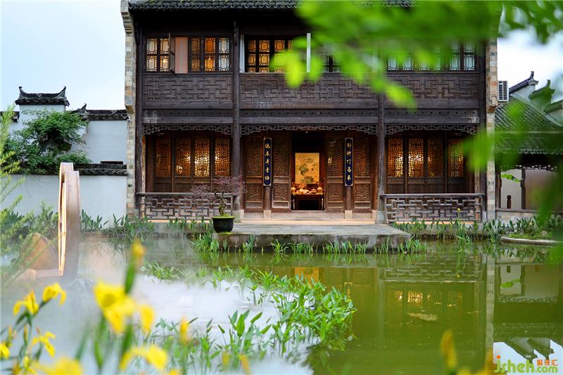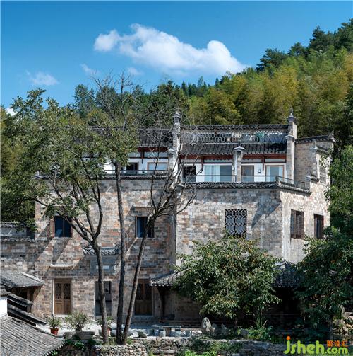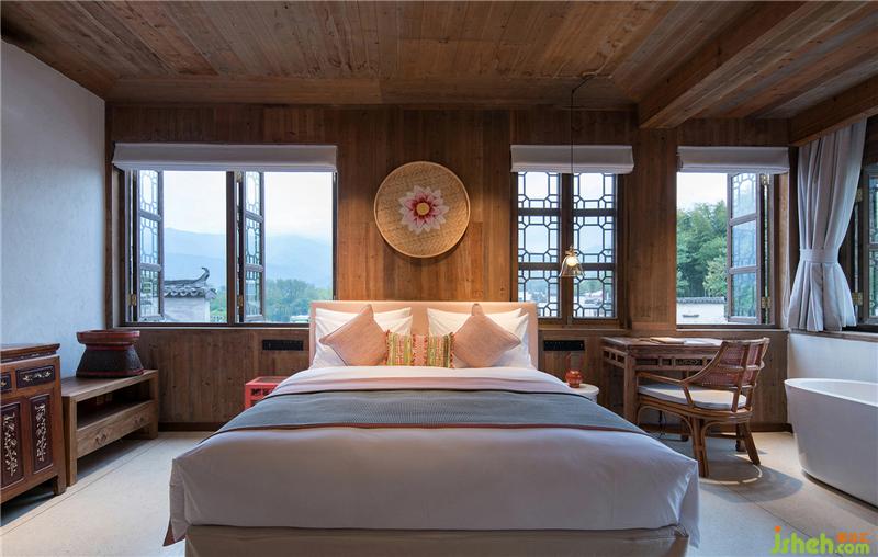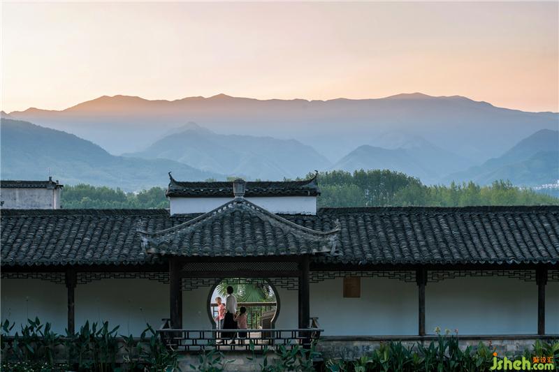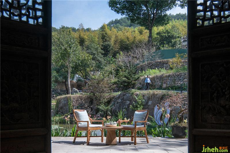 酒店由七棟不同時期建造的徽派建筑組成。建筑實施保護性修復(fù),做到修舊如舊并保持徽派建筑獨有的磚雕、石雕、木雕來做裝飾。利用地理優(yōu)勢將山間小溪引流,經(jīng)過酒店每棟建筑最終匯聚堂前形成一波清池。酒店設(shè)計