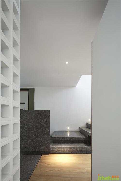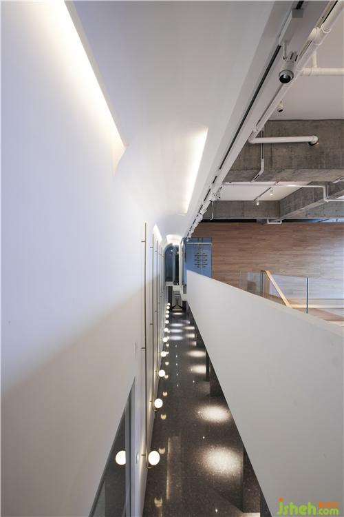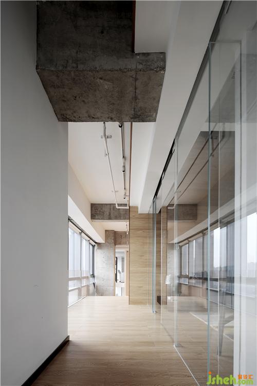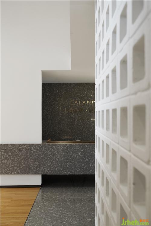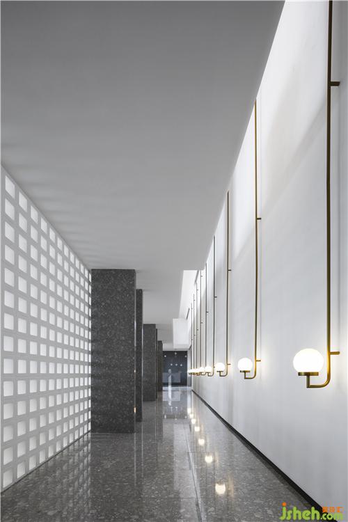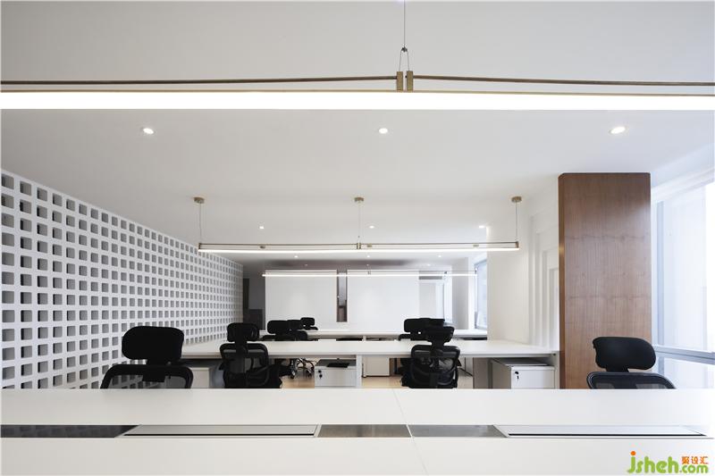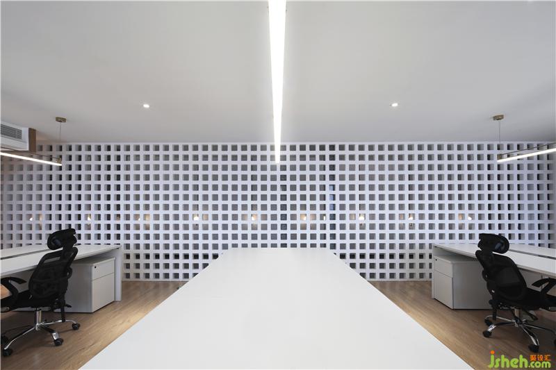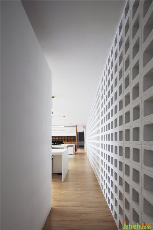 光穿透空心磚墻形成的光影效果,使過(guò)廊不再單調(diào)悠長(zhǎng)。辦公區(qū)不再滄白淡漠。辦公室設(shè)計(jì)