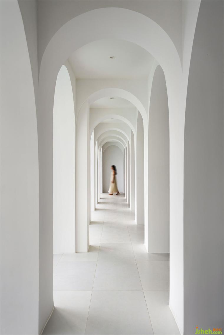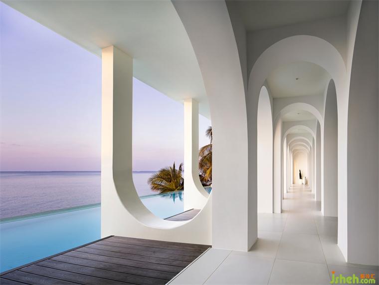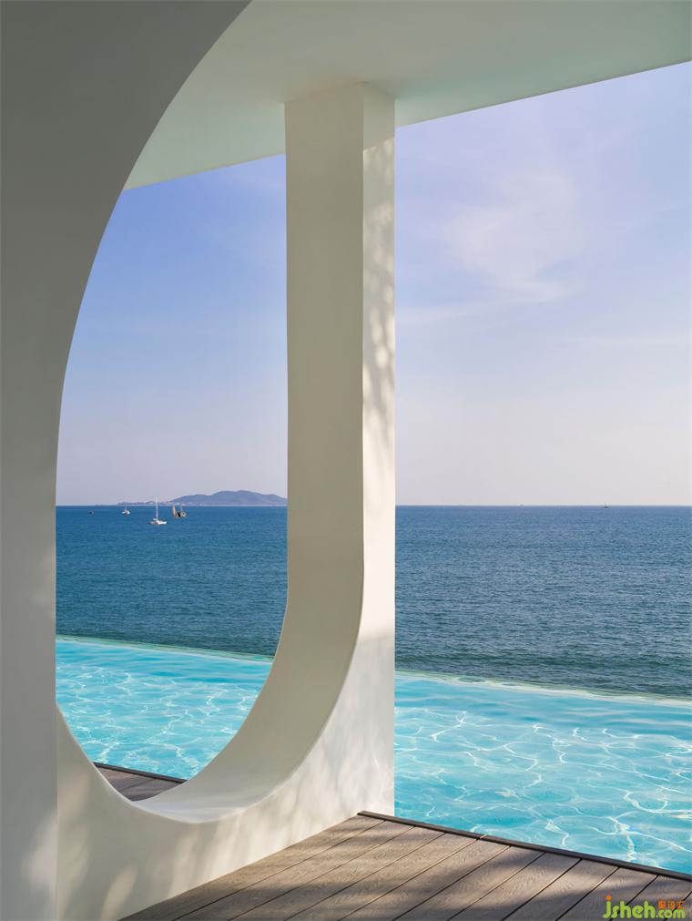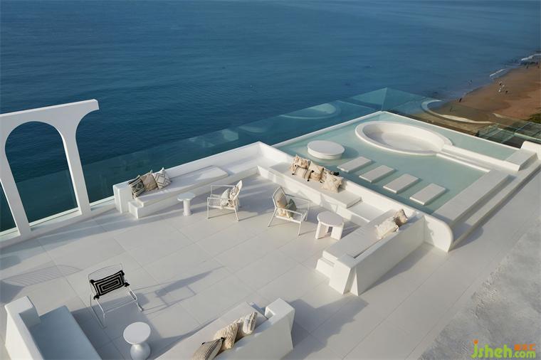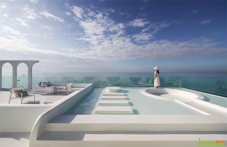 從無邊泳池延伸出去,精品酒店設(shè)計(jì)當(dāng)視線觸及純白與碧藍(lán)的無形銜接處,人的知覺和想象自然而然地轉(zhuǎn)移至天臺(tái)之上。