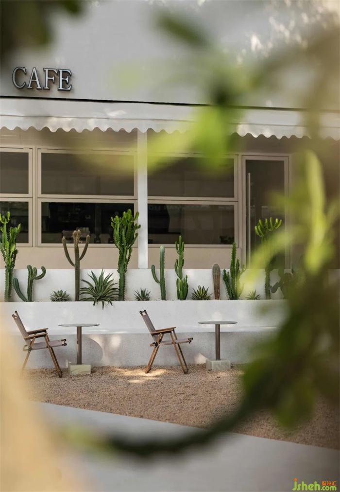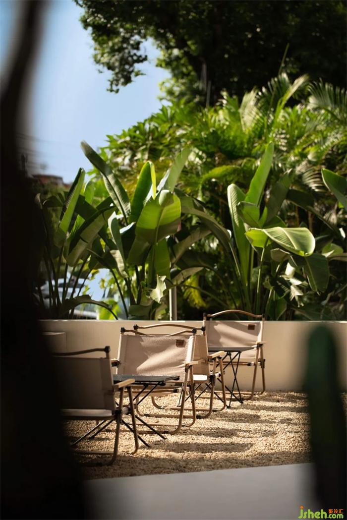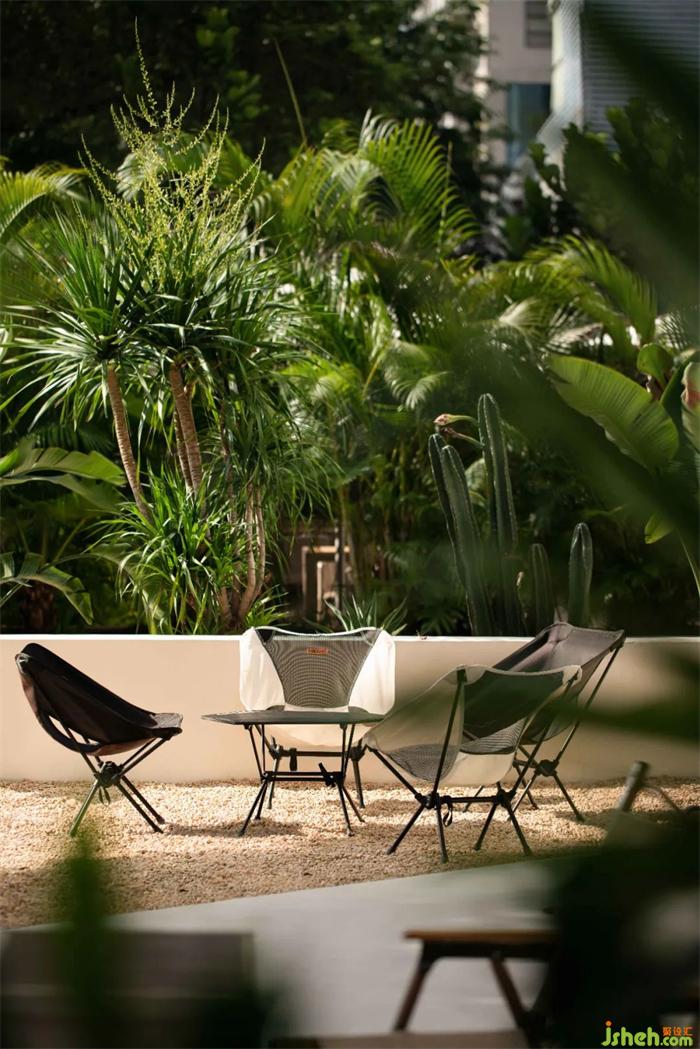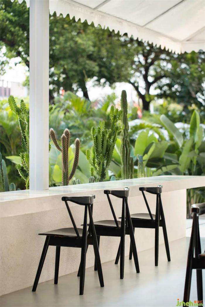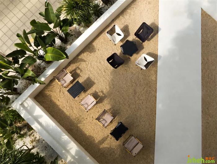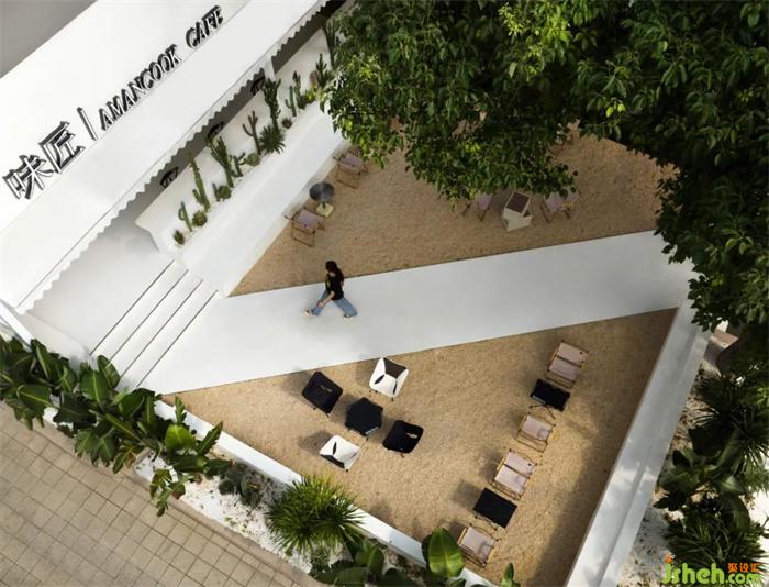 以步道斜角切分方形庭院的平面格局,輔以袒露大地肌理的植物與沙礫鋪陳,在儀式感與功能性中尋找平衡點(diǎn)。在植物墻的包裹營(yíng)造下,則以檐下連廊的空間過渡,強(qiáng)烈的參與性,餐廳設(shè)計(jì)將都市度假的場(chǎng)景融合到街邊巷尾的日常中,營(yíng)造出跨越地域與空間的豐富對(duì)話。