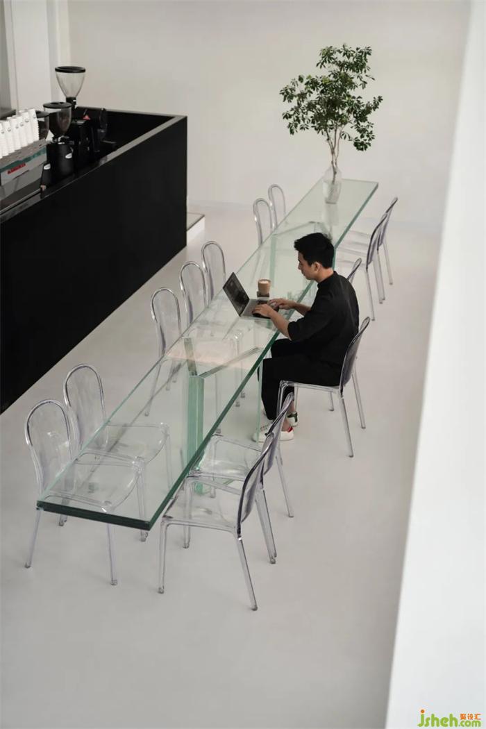 主空間中央的玻璃長(zhǎng)桌,通體透明的硬朗形體透露著工業(yè)時(shí)代的冷峻與嚴(yán)謹(jǐn),味匠咖啡廳設(shè)計(jì)而亞克力椅子的柔和曲線中和了其中的疏離,使得人們共處方式更加開(kāi)放多元。人們可以在這里視頻會(huì)議、活動(dòng)交流,充分表達(dá)自我,聯(lián)通外部世界。