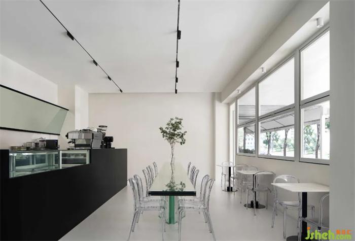 室內(nèi)空間以大面積的白色充斥兩個(gè)方盒空間的嵌套結(jié)合關(guān)系,并通過(guò)高差打造垂直緯度的豐富體驗(yàn)。對(duì)于當(dāng)代都市人群的生活預(yù)設(shè),咖啡不僅代表了一種生活態(tài)度,更是一種工作方式的延續(xù)。餐廳設(shè)計(jì)對(duì)于冗雜工作間的厭倦,使得人們轉(zhuǎn)向?qū)で蟾辛己皿w驗(yàn)的空間。