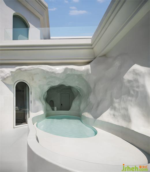 粗獷綿延的洞穴浴池連接室外的山海,私密而通透。臨池而坐,眺望遠(yuǎn)山與海,在此刻的靜謐中感受與自然相處的喜悅,蜜悅懸崖泡池美宿設(shè)計(jì)帶著近似冥想的心境也慢下來(lái),共同感受當(dāng)下安靜的力量。