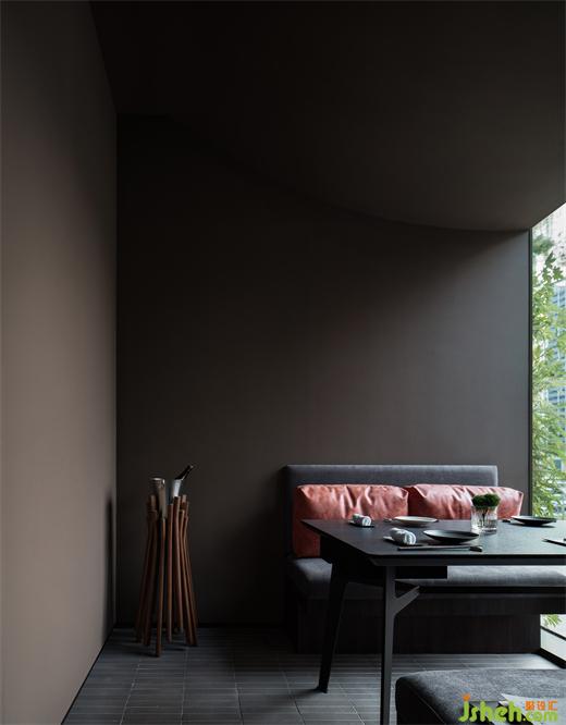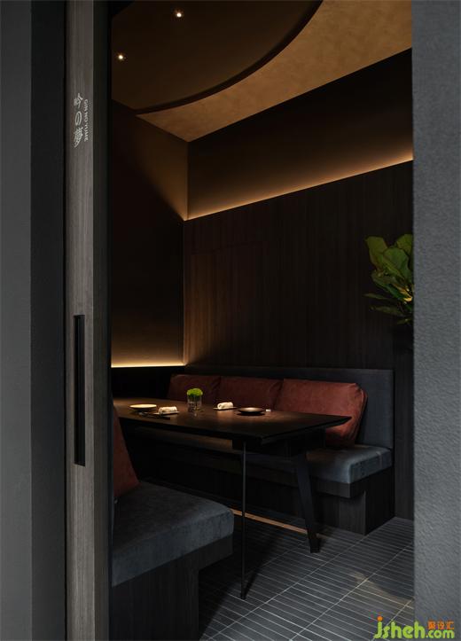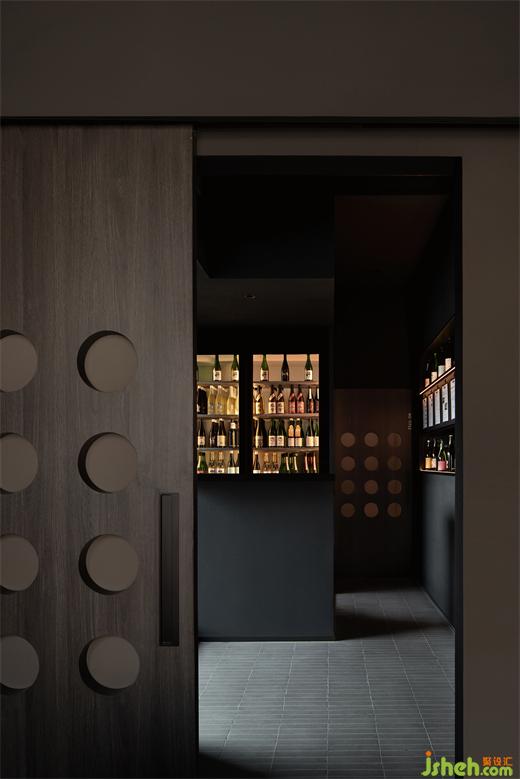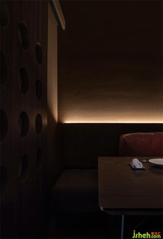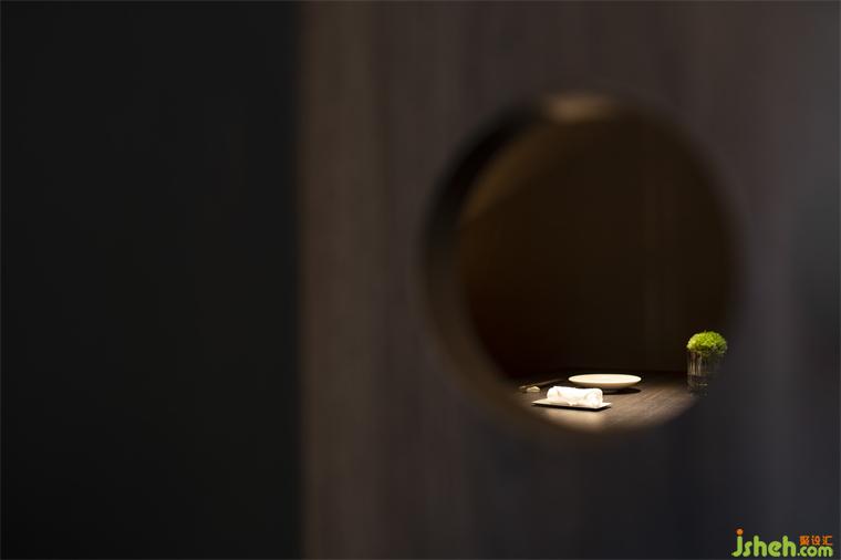 隔斷門上設(shè)置了一些圓形小孔充當(dāng)透視孔,小孔將外部場(chǎng)景投射到對(duì)面墻壁上,千年隼日本餐酒館設(shè)計(jì)讓客人感覺仿佛進(jìn)入一個(gè)“暗箱”。偷偷一瞥室內(nèi)景象,光線順著孔洞照射進(jìn)來,照亮一桌美食,猶如一幅靜物畫。有限的裝飾,卻引導(dǎo)出無限的空間想象。