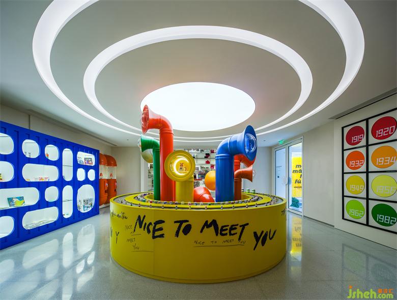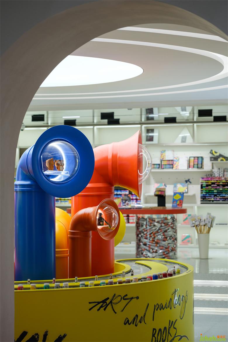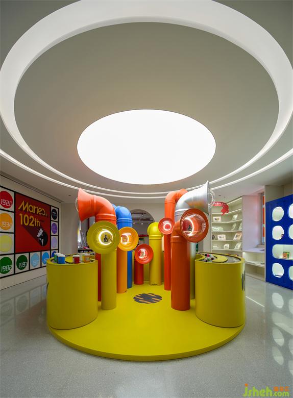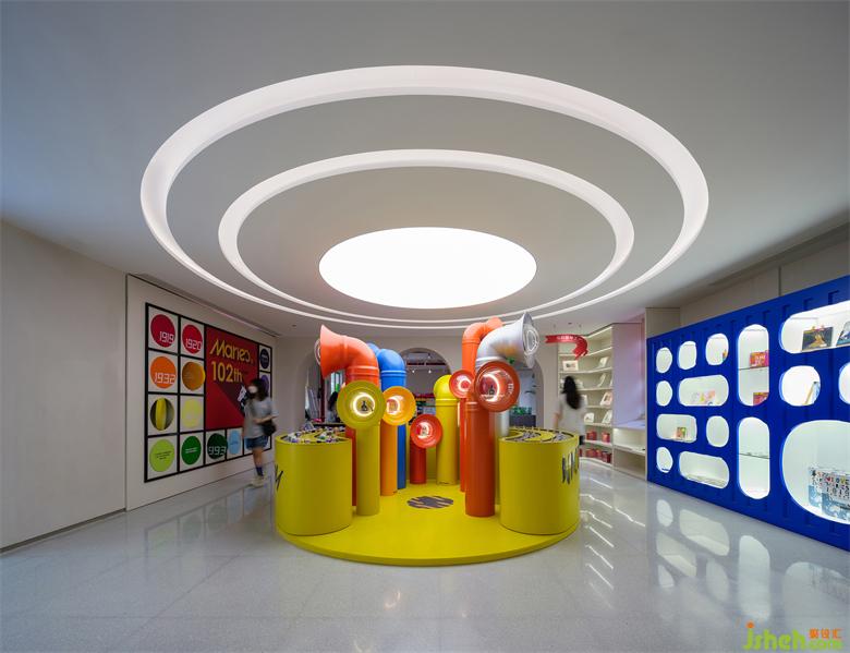 上海M+馬利 mamǎfufú超級(jí)百貨設(shè)計(jì)于不同立體面上以幾何形態(tài)去創(chuàng)造空間的旋律與活力,亦伏筆下空間里的呼應(yīng)關(guān)系。頂面的弧線燈光,與旋轉(zhuǎn)托盤展陳的色環(huán)以形態(tài)共和。色彩作為其中的主角,更是玩出了此起彼伏的鏈接花樣兒,紅黃藍(lán)三原色的碰撞,局部從整體色塊的提取,將“馬利”這個(gè)百年顏料品牌的“色彩主義”玩到了極致。