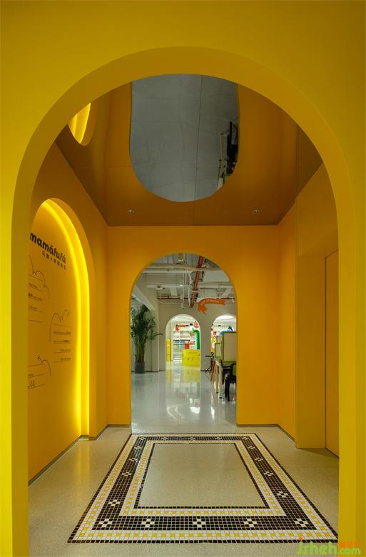 全色系飾面與燈帶串聯(lián),讓拱形元素切割而成彩色通道成為了通向夢想世界的時空隧道。時間在此刻靜止,光學藝術(shù)也得以無限放大,確保訪客完全地沉浸其中。