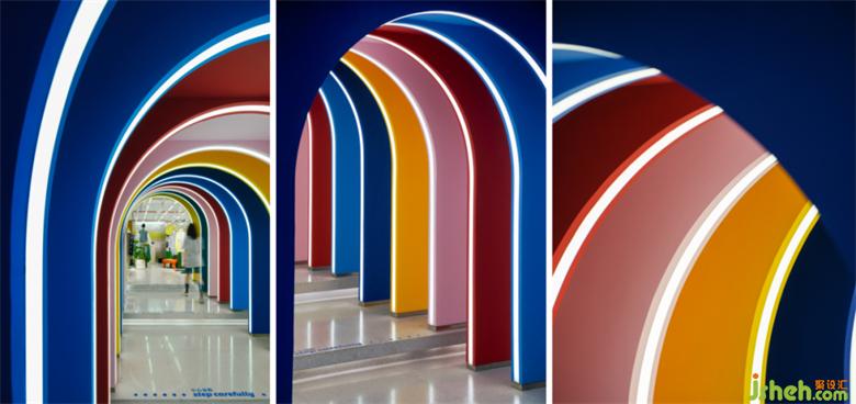 作為復(fù)合型空間形態(tài),即使是不同的功能體之間,上海M+馬利 mamǎfufú超級百貨設(shè)計亦給予了一以貫之的統(tǒng)一性與無間過渡性。在由顏料店到書店的過渡走廊,色彩的統(tǒng)領(lǐng)理念,以彩虹拱門的復(fù)迭形態(tài),瞬間點亮了原有的平凡,行走動線上的儀式感與視覺沖擊撲面而來。其顏值與形態(tài),可謂打卡出片的不二之地,潛臺詞里寫滿了設(shè)計欲引發(fā)自動傳播的商業(yè)賦能理念。