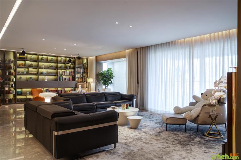 這個(gè)區(qū)域設(shè)計(jì)為集儲(chǔ)物、工作、閱讀為一體的多功能區(qū)。半開(kāi)放半封閉的木質(zhì)陳列柜占據(jù)了整片墻面,除書(shū)吧的作用外,深圳豪宅設(shè)計(jì)師希望為主人的收藏愛(ài)好打造一個(gè)展示空間,藏酒、藏書(shū)及瓷器雕塑等工藝品在此都可以得到全面的收納與展示,與相鄰極簡(jiǎn)設(shè)計(jì)的休
