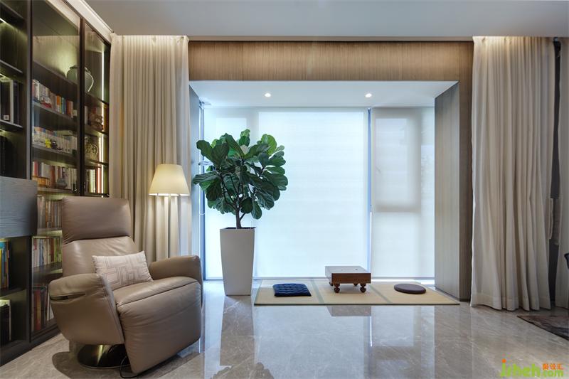 落地窗前放置一張竹席及棋桌,陽(yáng)光在磨砂玻璃的處理下暫避鋒芒,為主客執(zhí)棋對(duì)弈提供了理想場(chǎng)所。依靠沙發(fā)放置的寫(xiě)字臺(tái)保證了長(zhǎng)時(shí)間工作、學(xué)習(xí)的可用空間。