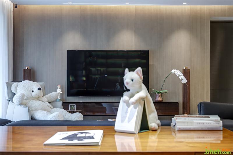 電視背景墻選擇木質(zhì)貼面,希望業(yè)主在休閑娛樂(lè)時(shí)的觀影環(huán)境更加柔和放松,大屏顯示器及棕色木質(zhì)電視柜懸掛在上,隱藏線(xiàn)纜圍繞極簡(jiǎn)的主旨,便于清潔。兩側(cè)金屬立式音響相較傳統(tǒng)音響頗具設(shè)計(jì)感。