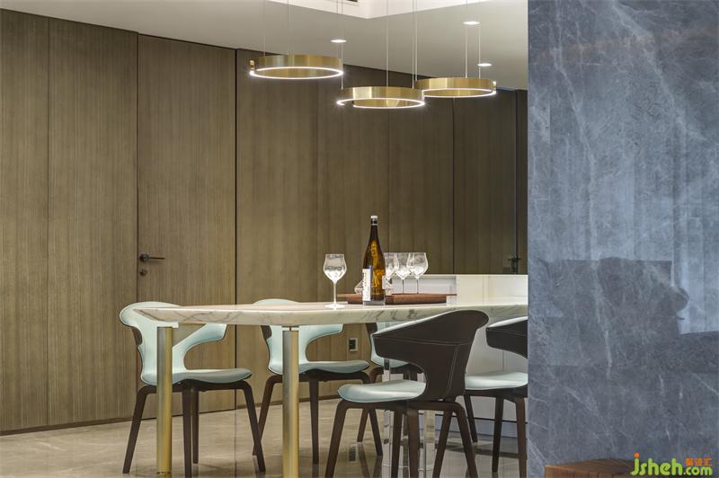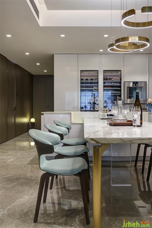 餐桌選擇六座西式餐桌,采用白色大理石臺(tái)面和金色啞光噴漆桌腿,搭配霧霾藍(lán)皮質(zhì)餐椅,整體清新淡雅的色調(diào)使畫(huà)面明亮整潔,深圳豪宅設(shè)計(jì)照明采用與桌腿相呼應(yīng)的啞光金屬不閉合環(huán)形吊燈,三燈錯(cuò)落有致。一側(cè)的內(nèi)嵌式水吧和儲(chǔ)物柜滿(mǎn)足儲(chǔ)物和生活需求。