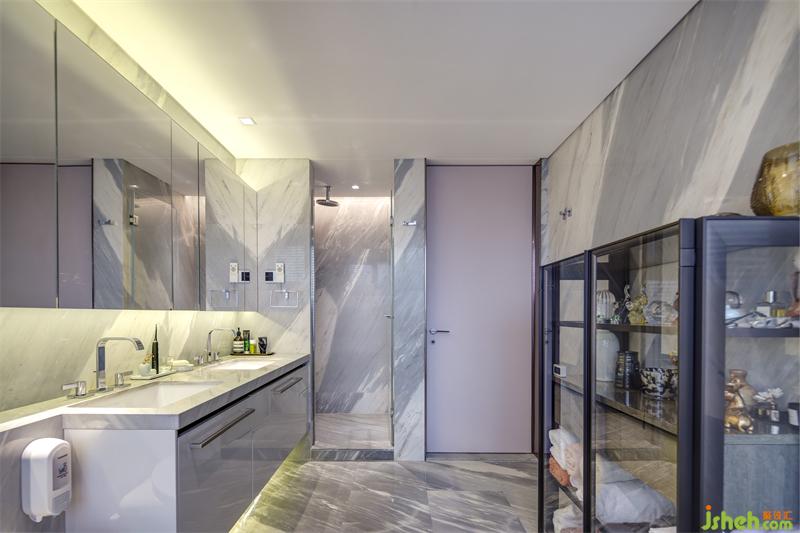 衛(wèi)生間全面采用意大利進(jìn)口的藍(lán)金沙大理石無(wú)縫貼面,獨(dú)特的色彩簡(jiǎn)約大氣,典雅奢華,以墻體分隔出獨(dú)立密閉的淋浴間使衛(wèi)生間干濕分離更加徹底。