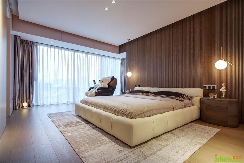 主臥延續(xù)客廳的黑白灰棕主色調(diào),但采用了更加溫暖的配色。設(shè)計(jì)全景落地窗讓視角更加開闊,希望幫助主人在忙碌生活中調(diào)劑心情。