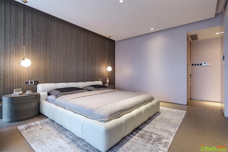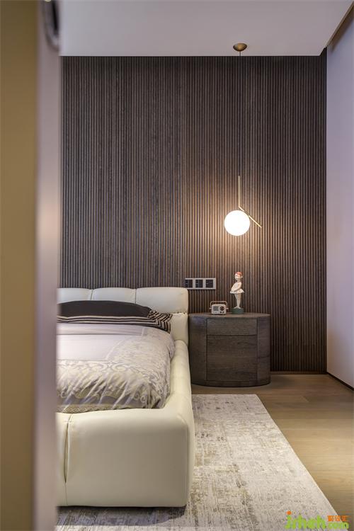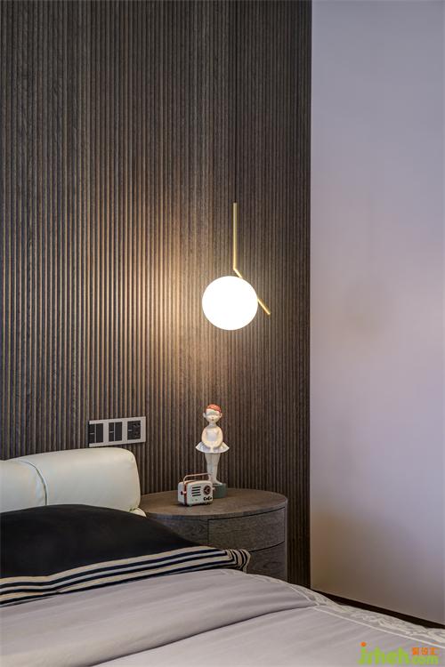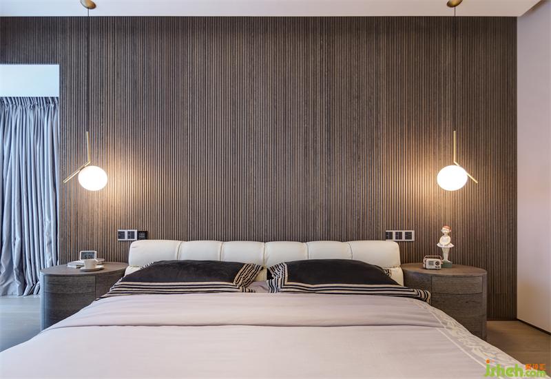黑灰色細(xì)條紋酸枝木貼面墻前對(duì)稱的窗前吊燈及床頭柜配色統(tǒng)一而不乏味,球形吊燈適用臥室柔和的整體氛圍需求,雙聯(lián)開關(guān)設(shè)計(jì)避免了主人日常起居不必要的麻煩。