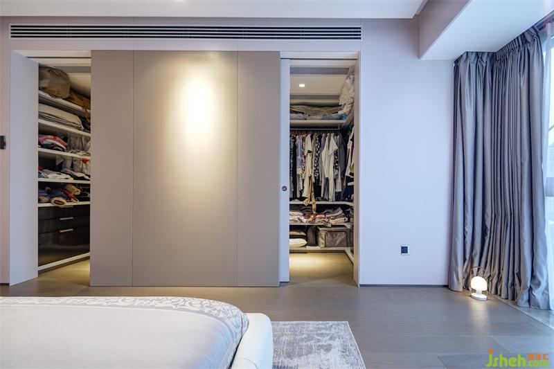 衣帽間直接連接主臥,設(shè)計(jì)隱藏式推拉門分隔臥室和衣帽間,三面環(huán)繞的儲(chǔ)物柜便利了主人的每日穿搭,也為主人的服飾、箱包及床品等生活用品提供了儲(chǔ)存空間。
