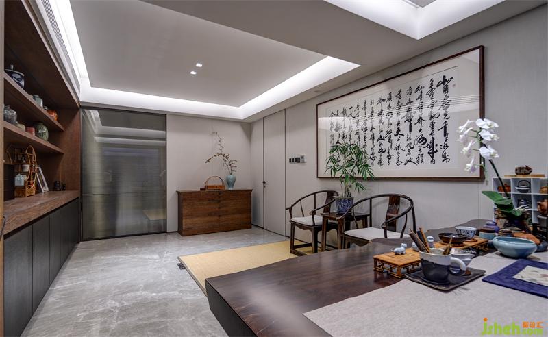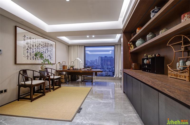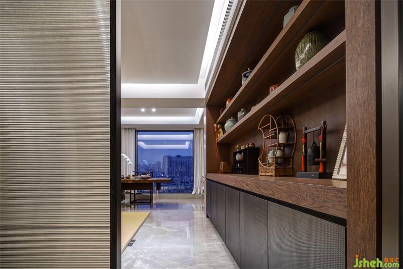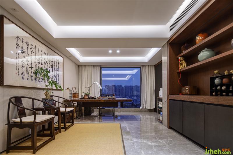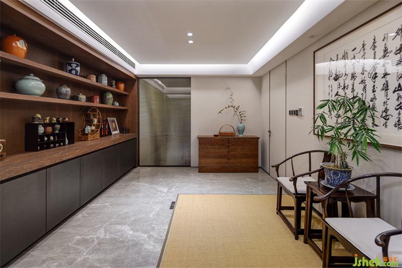 拉絲玻璃作為茶室與走廊的隔斷既保證了隱蔽性又不顯拘束,茶室內(nèi)大面積采用草木元素,適應(yīng)書房的整體調(diào)性。設(shè)計(jì)師在一側(cè)墻面設(shè)計(jì)展示柜,希望將業(yè)主的各式工藝收藏品得以展示,與對(duì)側(cè)墻面懸掛的大幅書遙相呼應(yīng),彰顯主人品味。草編地毯上的檀木太師桌椅與落地窗前的寫字桌適合主人伏案工作,也適合與三兩客人商談閑聊。