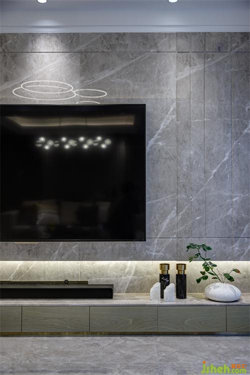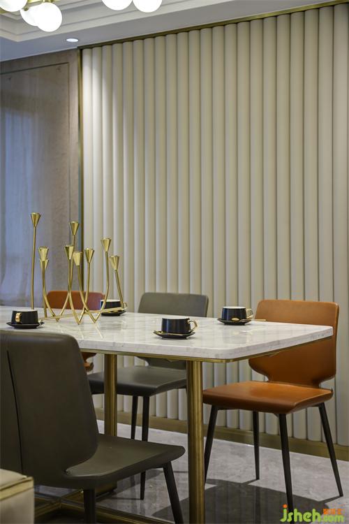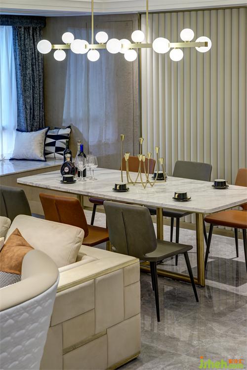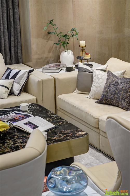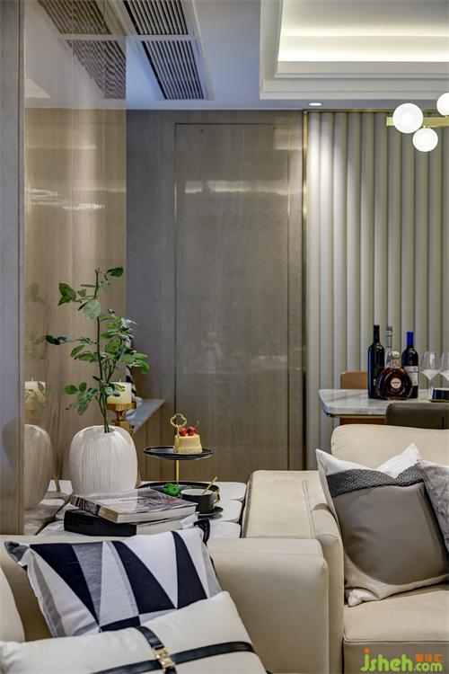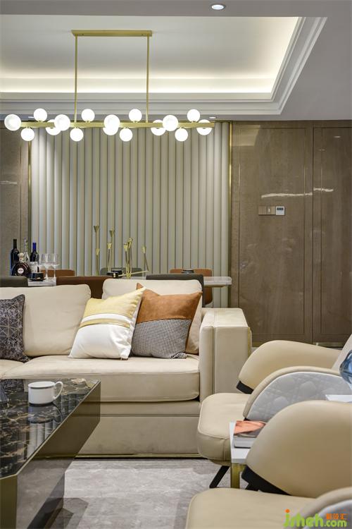 客廳區(qū)域,我們以偏暖色的卡其色為基調(diào),黃棕色作為點綴色,沖撞出微妙的美感?,F(xiàn)代輕奢設(shè)計造型上“理性”的運用線條,僅從水平和垂直角度去詮釋現(xiàn)代輕奢藝術(shù),石材以及簡約的吊燈,顯得不那么平庸與造型融為一體。