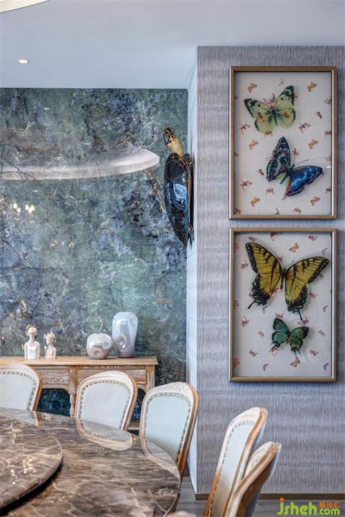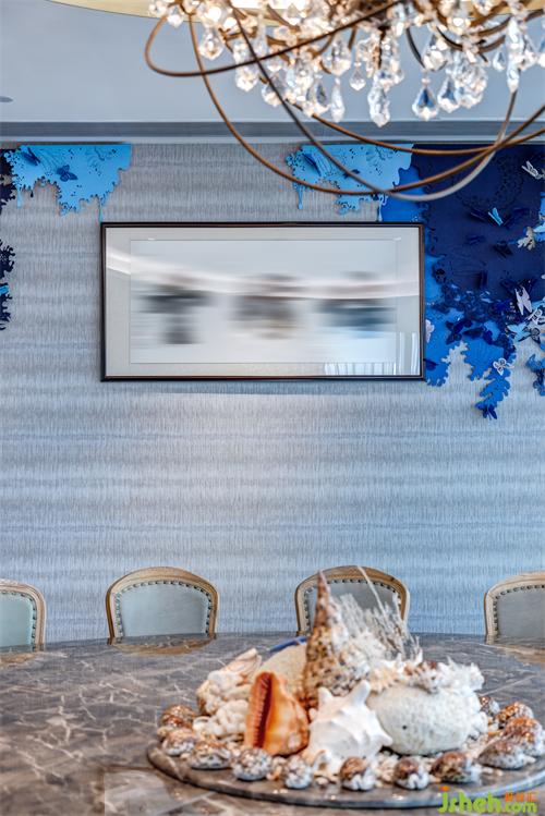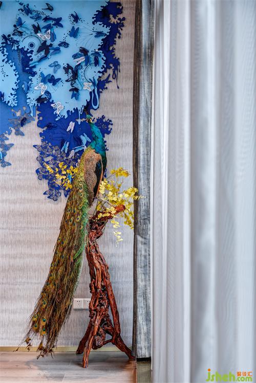 明朝的呂紀(jì)有一幅名畫《杏花孔雀圖》,描繪了孔雀長(zhǎng)尾垂地,棲息引頸張望,而一旁的古杏正開得熱鬧,深圳辦公室設(shè)計(jì)花枝交相輝映的美況。我們將古畫的美還原出來,讓空間多了幾分古色古香的意蘊(yùn)。配合墻上的藍(lán)色蝴蝶裝飾物,更添幾分詩意韻味。
