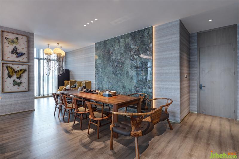 品茗區(qū)的背景墻,我們采用了煙青色的大理石磚,就像一杯剛剛沏好的綠茶,濃淡適宜,意在制造一種清遠(yuǎn)閑散的氣氛。