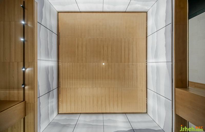 主要材料:木飾面、透光膜、米黃色石材、深灰色不銹鋼、深灰色鋁單板