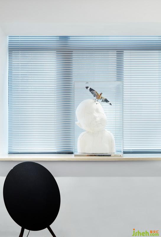 作為辦公空間前區(qū)(公共區(qū)域)的設(shè)計,設(shè)計師在空間中置入了一個向四面伸展的爆炸形裝置,如同一個多個方向的漏斗,連接著各個不同的功能空間,成為交通核的同時又為各個空間提供釆光與通風。傾斜的黑白構(gòu)圖打破一些平衡,形成一些視錯覺,活躍了空間氣氛。