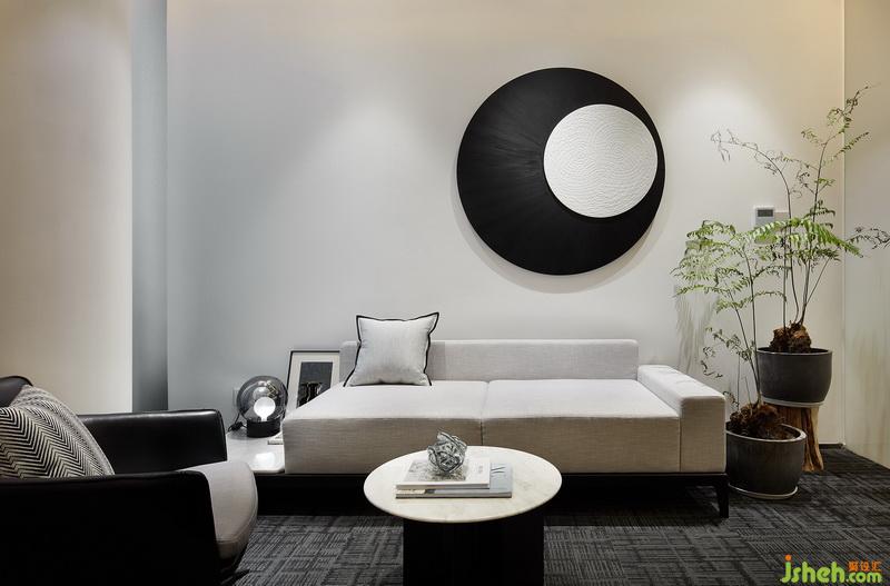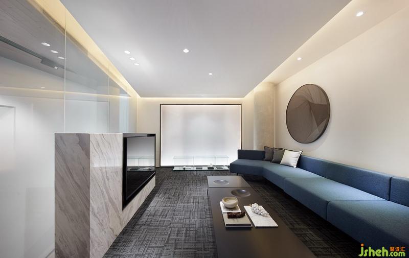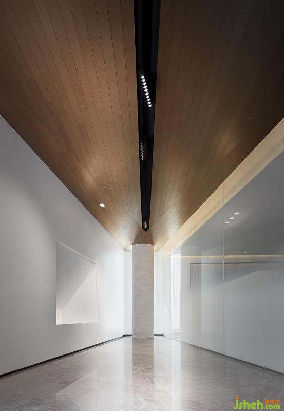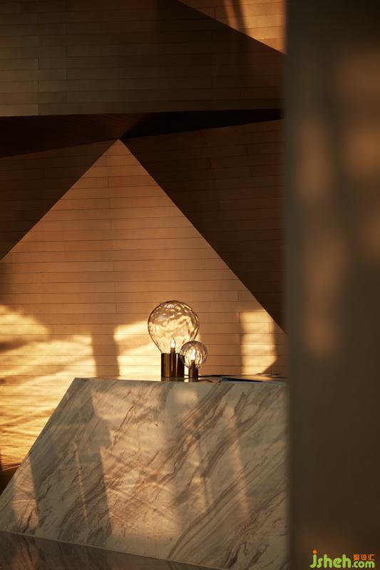 在這個框架內,設計師結合基礎空間的特點,把注意力集中在天花和地面,將之作為表現(xiàn)的重頭部分,以顏色有微妙變化的暖黃色調為基礎,將天花解構成大小和角度多變的體塊,既是協(xié)調統(tǒng)一的整體形態(tài),又在不同的角度呈現(xiàn)各自所有的個性;而將垂直面只作規(guī)矩的大塊面分割處理,既能簡潔輕巧的展現(xiàn)空間秩序,又與天地形成明快悅目的疏密關系。