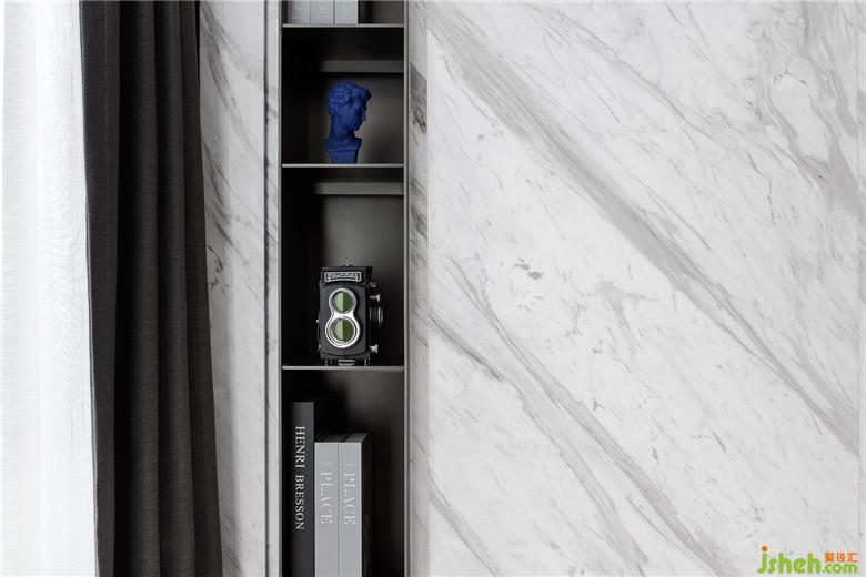 一層是“房東”攝影師,喜歡用影像記錄生活,崇尚極簡,善于把握色彩之間的強(qiáng)烈對比。由此而生,他的居所由黑白的強(qiáng)烈沖撞構(gòu)成主要個性,再用木飾面柔和此間的沖突。亮眼的鈷藍(lán),以不同的體塊、質(zhì)感和灰度循序漸進(jìn)地導(dǎo)入。
