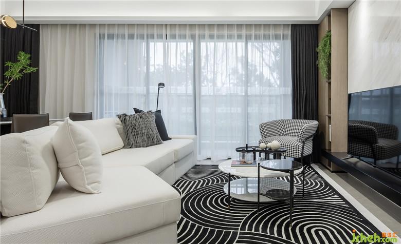 作為這三套樣板間中面積最大的一個,空間以深淺不一的灰與白作為基調(diào),線條明朗而直接。軟裝通過線條的改變來打破空間原有的穩(wěn)定,弧形圍合的茶幾,不規(guī)則的沙發(fā),與大面積圓形交錯的黑白地毯,碰撞出一種微妙的平衡感,斂去了方正空間的沉悶。