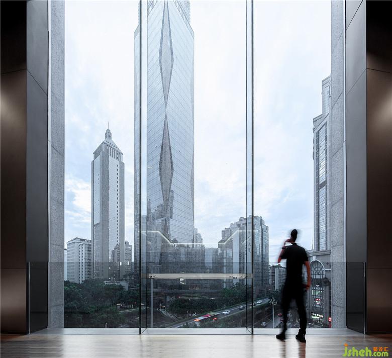 透過通透玻璃幕墻,這塊獨特的空間被向外進一步延伸,與自然環(huán)境之間有了更深刻的關聯(lián)。由內(nèi)向外望去,它像在隔絕空間里被注入的一次深呼吸;而站在大廈之外,它就像是一個鑲嵌在空中的巨大櫥窗,在溫暖的燈光的映襯下,猶如這座屹立了20年的建筑終于向城市打開了自己的內(nèi)心世界。