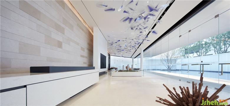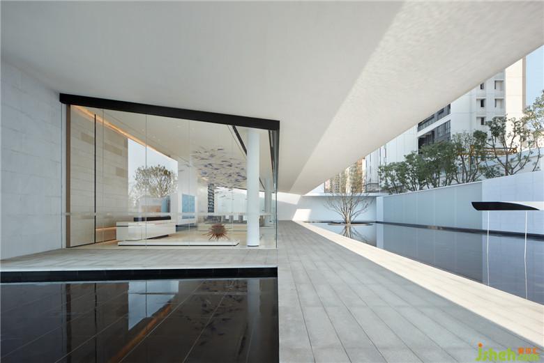 作為一個體驗中心,接待是必須具備的功能,而展現(xiàn)與地方文化相融的生活美學(xué)是它“體驗”的價值所在。從簡潔的立面,充滿幾何線圖的形體構(gòu)造中你很容易讀出它所穿著的“現(xiàn)代主義建筑”外衣。細(xì)細(xì)端詳之下,在它腳下映衫著倒影的水面上,開合有度的空間格局里,源自中國傳統(tǒng)文化的留白藝術(shù)被鑲嵌其中。