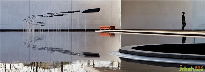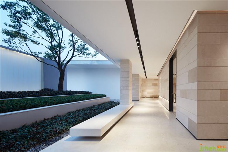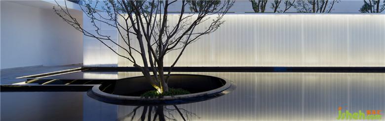 穿過連接前廳與后廳的連廊,一簇枝椏立于水面,身旁墻面素凈,背后天空寂遼,不大的天地方寸間卻為它留下了的無限的空白與想象,在水面的倒影里彷佛有寂靜的詩(shī)意在低語(yǔ)。