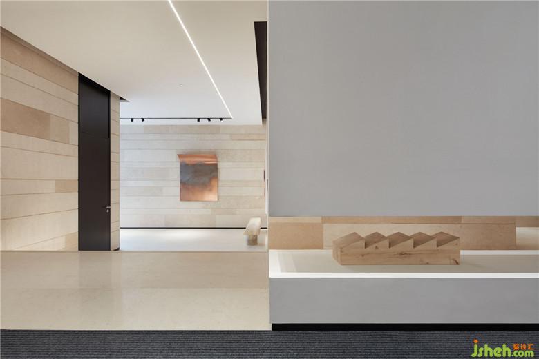 內(nèi)退的玻璃隔斷在打開的空間里劃出了前廳核心的接待空間,通透的質(zhì)感保持了內(nèi)外視野的連接,讓空間隔而不絕。玻璃隔斷的內(nèi)退為景觀與內(nèi)部空間留下融合的余地,同時(shí)建立內(nèi)外兩條流動(dòng)動(dòng)線,免去過多紛擾,避免“過滿則溢”。在前廳內(nèi),設(shè)計(jì)師摒棄了一切多余的結(jié)構(gòu),保持空間整體的通透與輕盈,前臺(tái)、沙盤、洽談區(qū)依序安置,三兩藝術(shù)品點(diǎn)綴層次,對(duì)建筑的初心保持尊重,以少,見多。