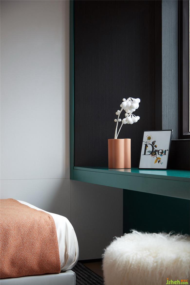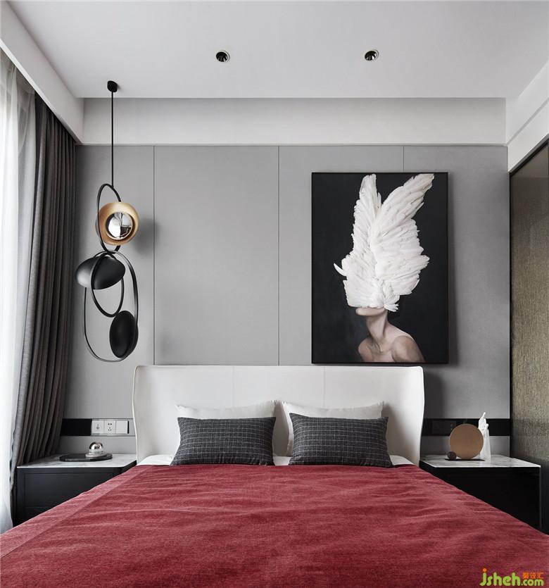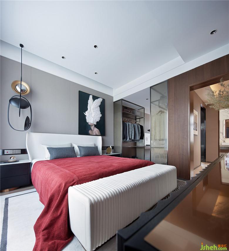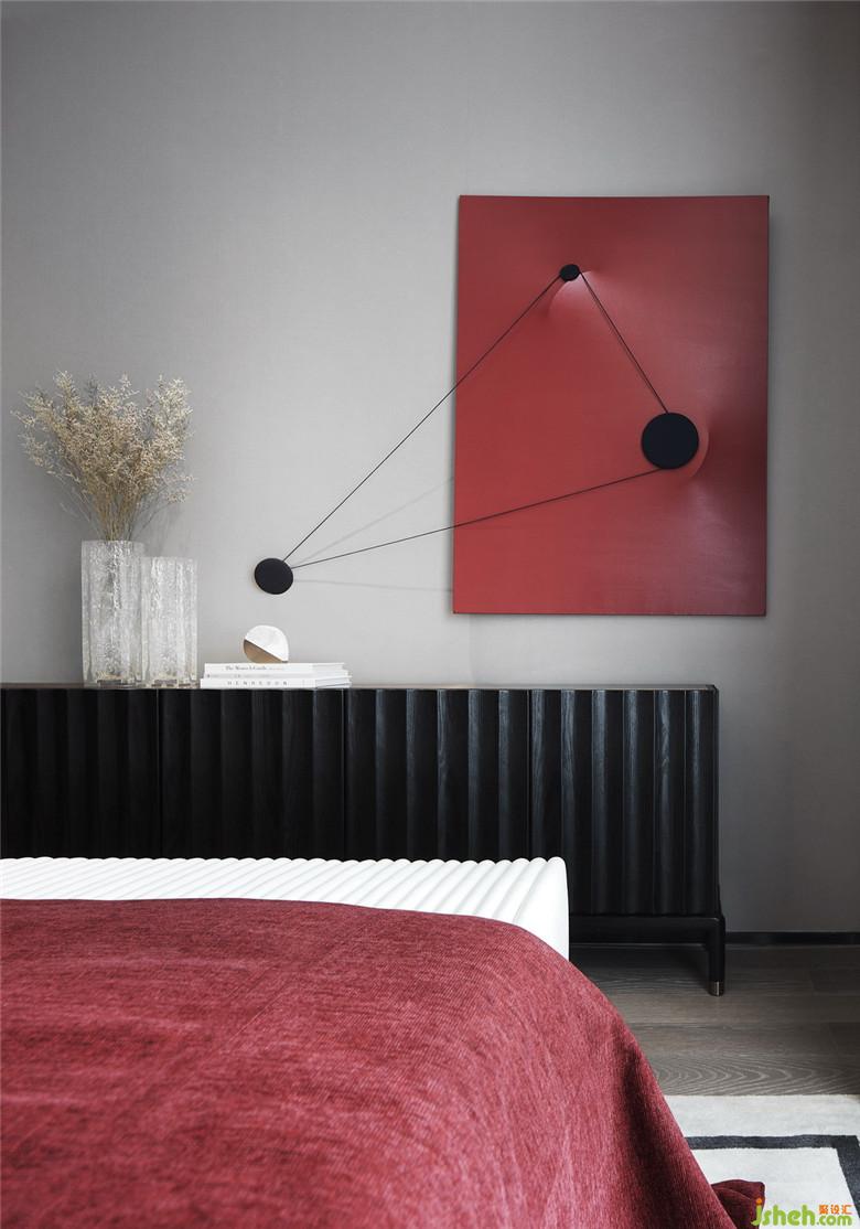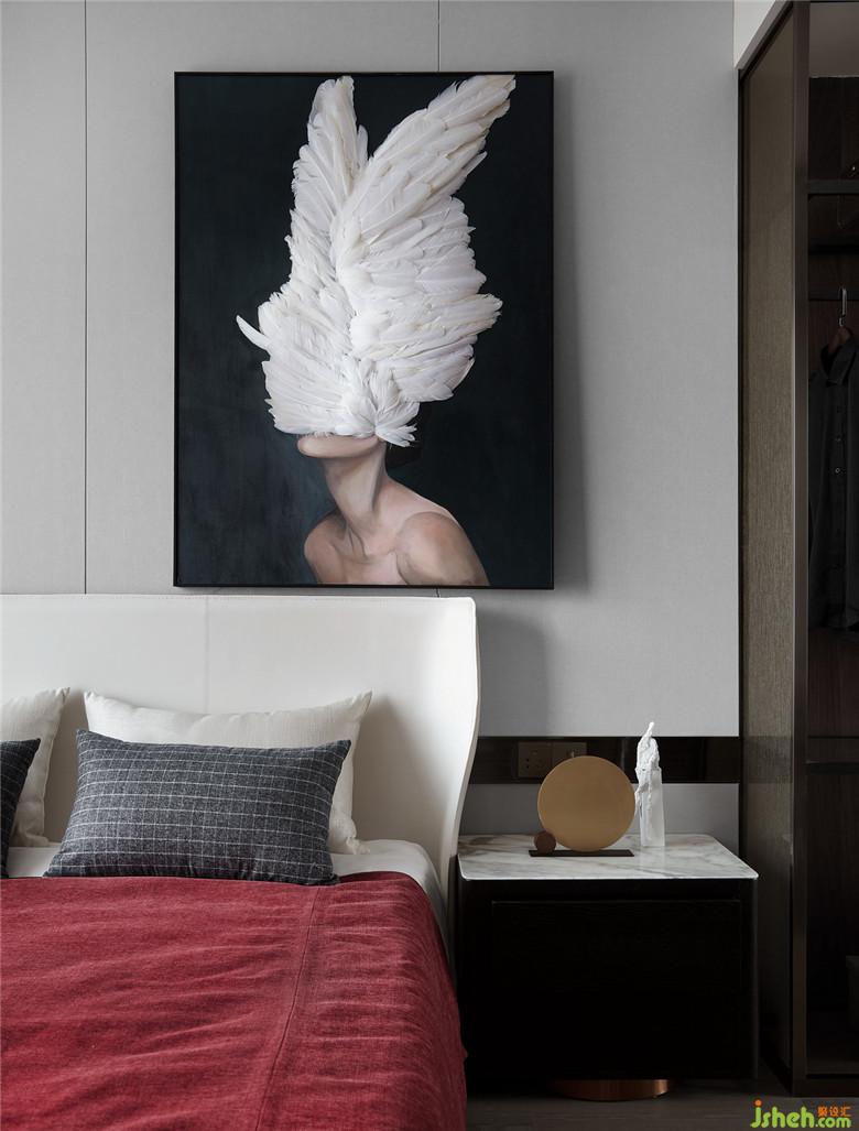 設計通過色彩的變化營造私密感,濃烈的紅色在此再次被強調(diào),肌理感被體現(xiàn)在邊柜的黑色木質(zhì)紋理、床品乃至掛畫上手工鑲綴的羽毛。