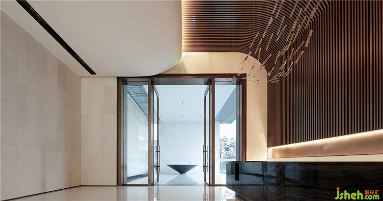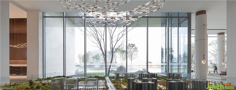 花都濱水新城,位于花都CBD中軸線之上,左擁廣州北站,右攬空港經(jīng)濟(jì)區(qū);越秀·濱湖臻品系,占去花都濱水新城半壁江山,是該區(qū)少有的商業(yè)、學(xué)校、地鐵、住宅一體化項目;越秀臻榮府,花都首個4.0智慧社區(qū),其銷售中心位于花都湖濕地公園旁,門口便是宮粉花海,網(wǎng)紅打卡勝地。仿照桃花源路線安排,臻榮府銷售中心入口“隱蔽”處理。訪客穿過花海,踏過水景,入目只得一堵白墻,走近灰空間,才可見入口大門。推門進(jìn)入大堂前臺,經(jīng)過一道狹長的通道,走進(jìn)洽談區(qū),視線便豁然開朗起來,落地玻璃幕墻保證自然光的充分透入,讓室內(nèi)顯得寬敞明亮,庭院的景色亦一覽無遺。