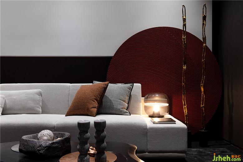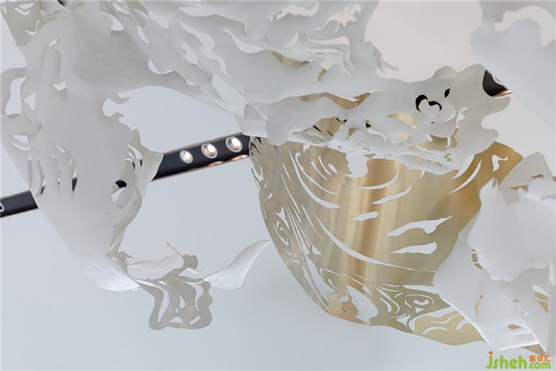 小尺度空間里的布局,主要是立足于“小”與“大”的矛盾與調(diào)和,通過空間與藝術品、家具之間的感知形態(tài)分割空間,以四時之氣生發(fā)空間靈韻,使空間更深層次的美感表現(xiàn)為回歸自然,落在入口是雕塑上的一片葉脈,飄到沙盤區(qū)是流螢般盤旋而上的燈群,飛到洽談區(qū)上空便是朵朵祥云,泊到墻上是一方寫意石材山水畫,跌到人的心坎里變成一首詩:草榮識節(jié)和,木衰知風厲;雖無紀歷志,四時自成歲。