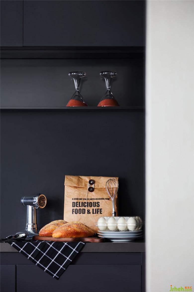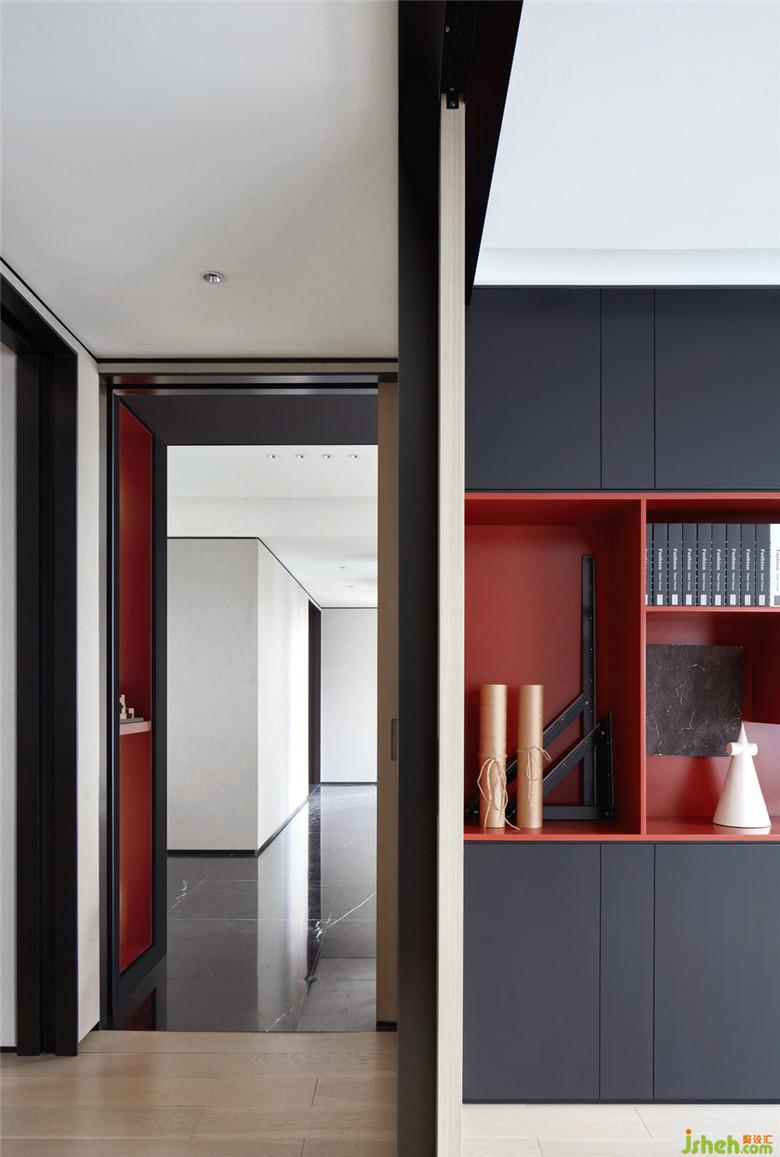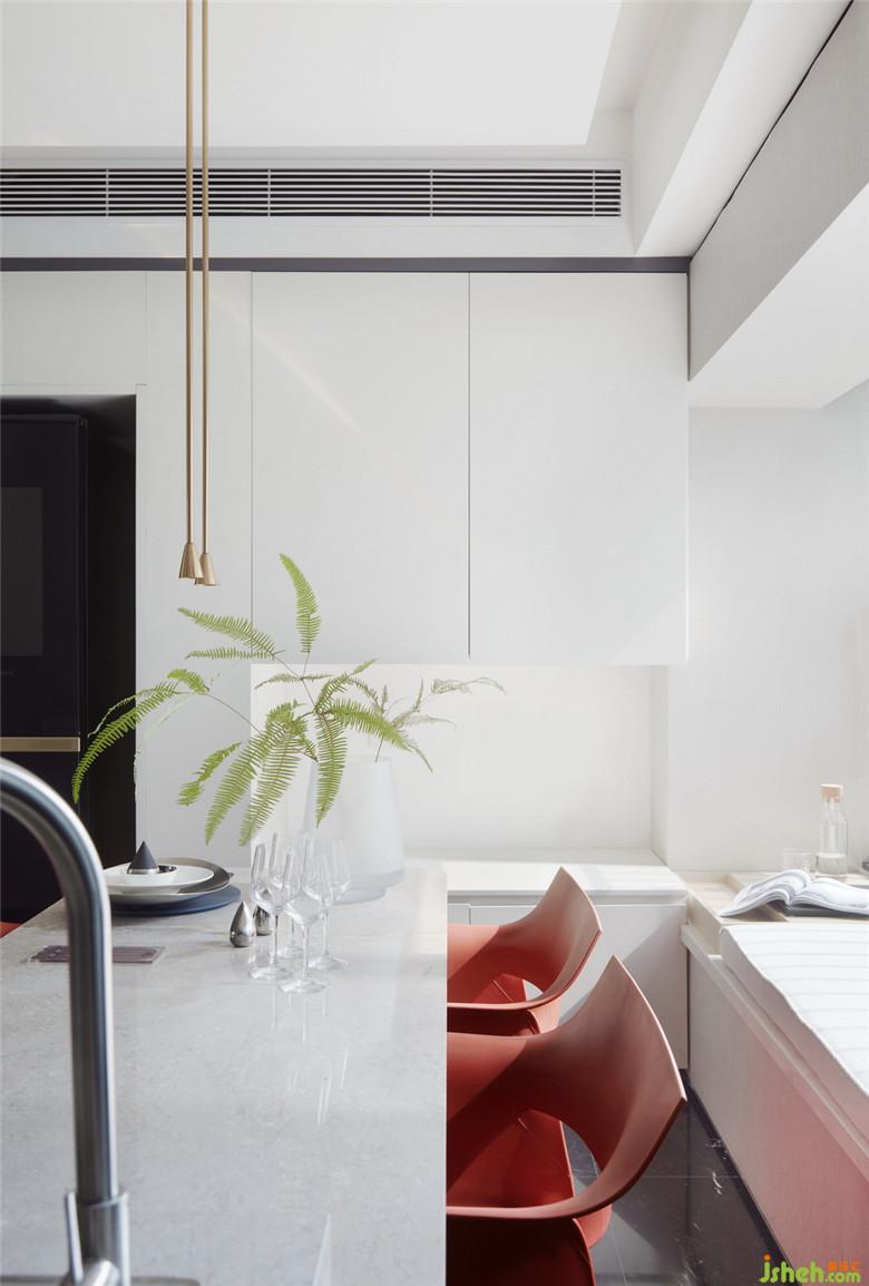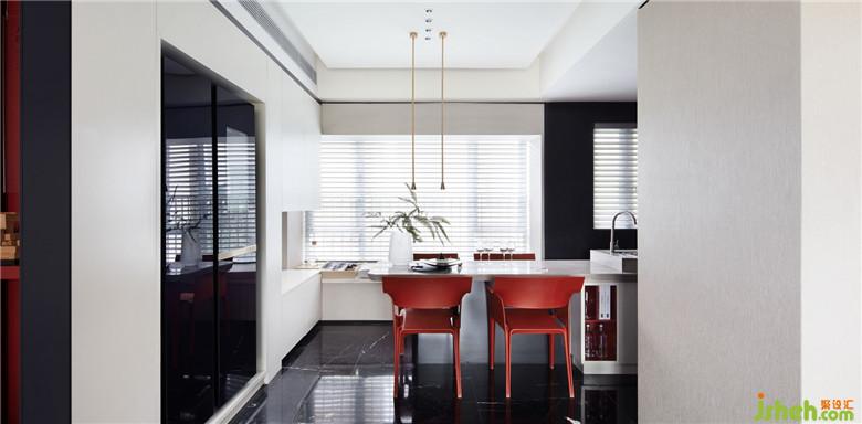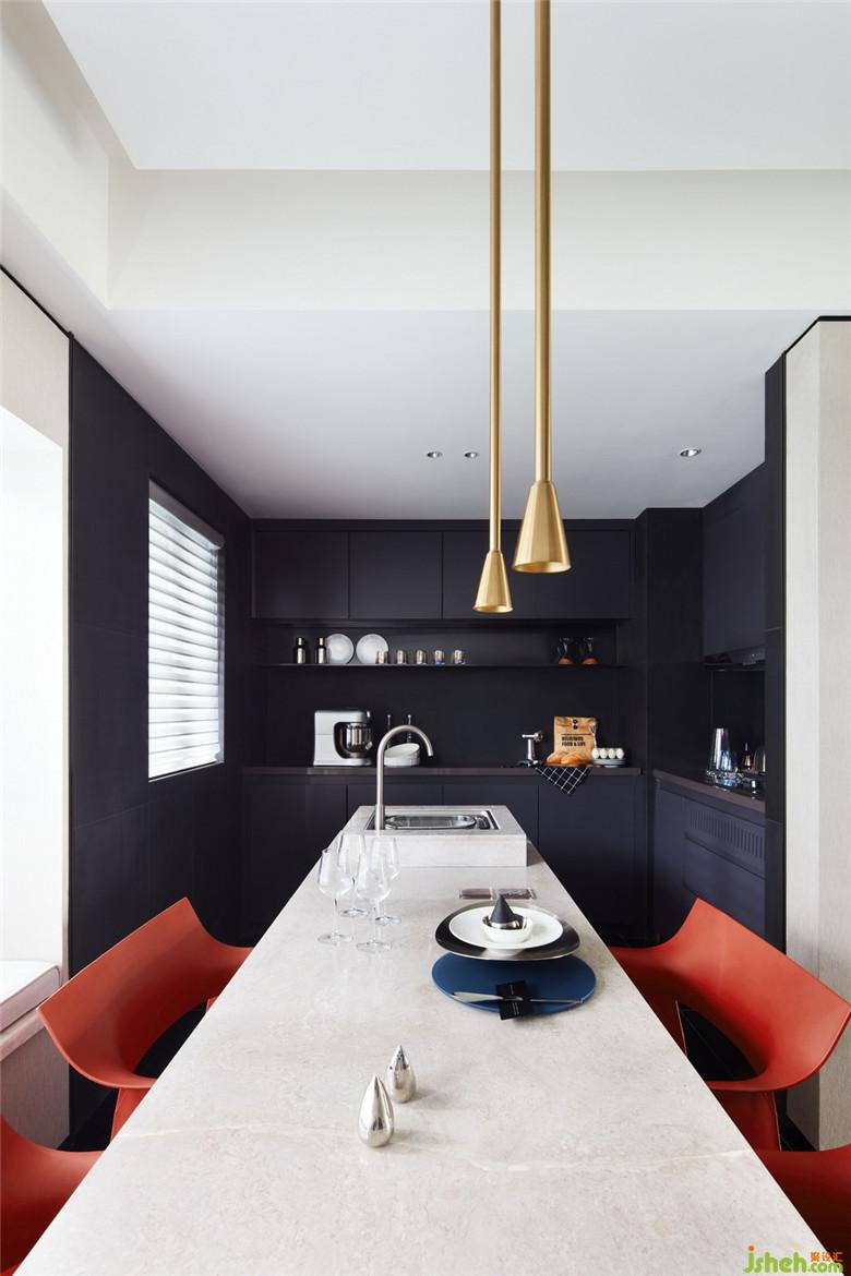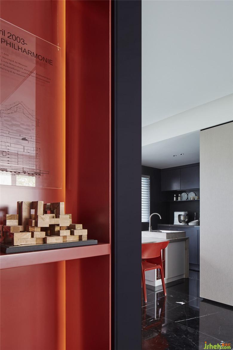 開放式廚房與餐廳二合為一,它們與沙發(fā)區(qū)相對,建構(gòu)出一個歡快交融的互動性起居場景。紅藍主調(diào)的空間配色使人想起蒙德里安的風(fēng)格派畫作,強烈原色的構(gòu)成中暗含生活邏輯。