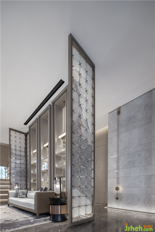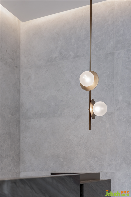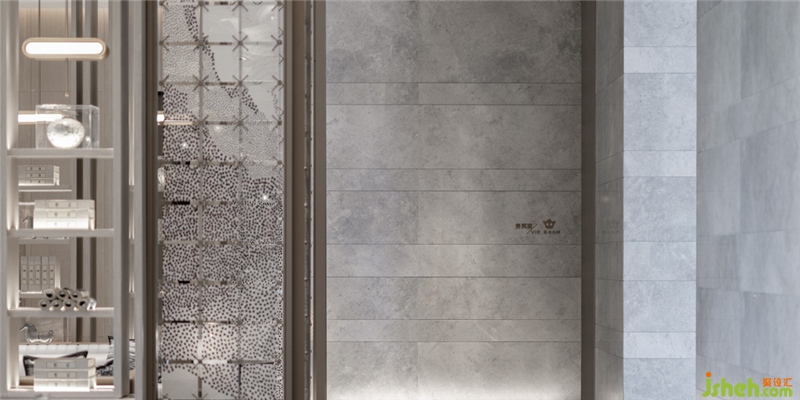 主要材料:奧地利灰大理石、藍色烤漆板、古銅色不銹鋼、藝術玻璃、實木