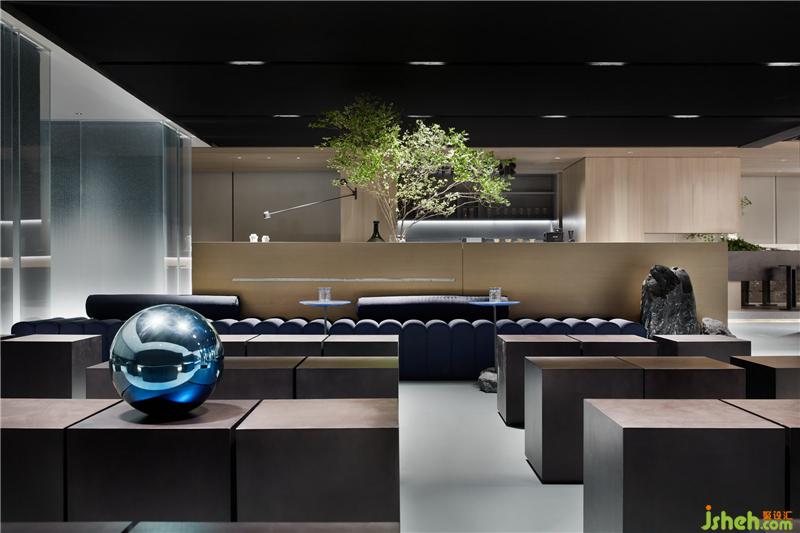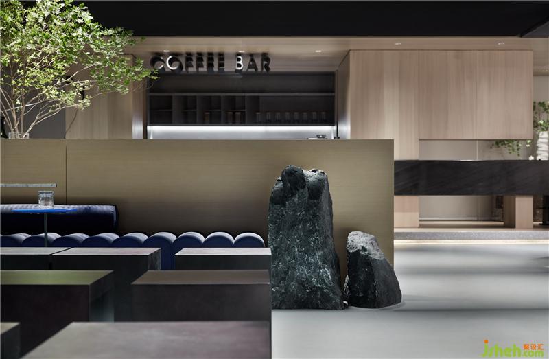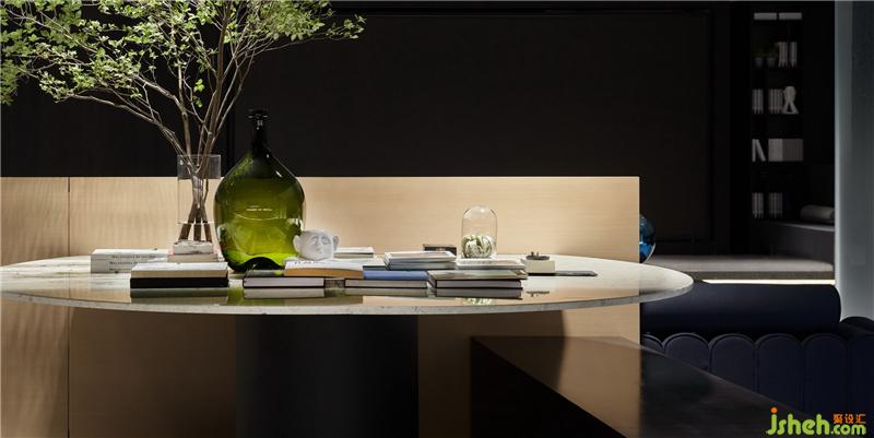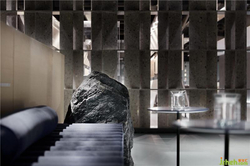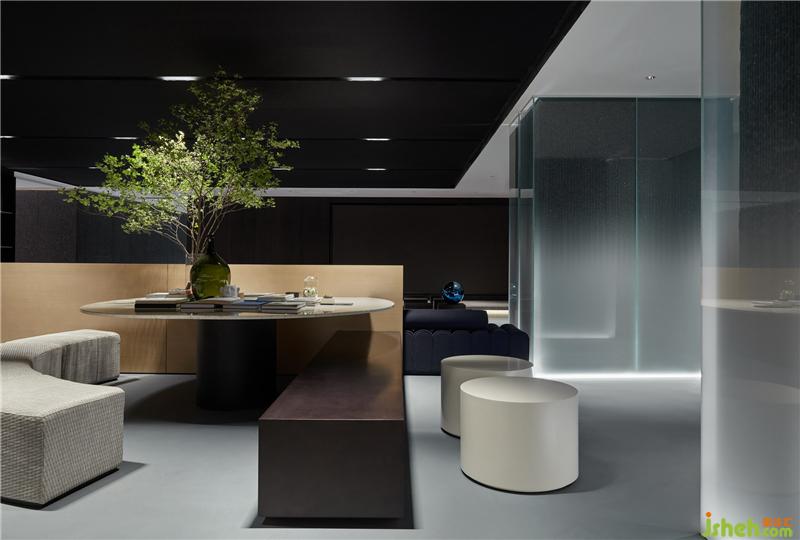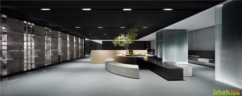 從入口處黑色的粗糲肌理的塊面,到前廳光滑如鏡的鵝卵石,是自然對(duì)材質(zhì)干預(yù)之后兩種形態(tài)的抽象。循序漸進(jìn),接待廳一個(gè)由若干塊木板切磋、雕琢、疊組而成的《擁抱》裝置,保留了木質(zhì)的肌理和手工的痕跡,象征著人與自然改造的初級(jí)形態(tài)。裝修公司