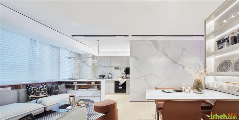 開放式廚房與沙發(fā)區(qū)、沙發(fā)區(qū)與餐廳交互,不再以電視機為中心布局。