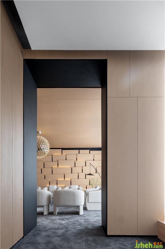 三層空間圍繞著中心的藝術(shù)裝置,由一個(gè)個(gè)彼此獨(dú)立而私密的功能板塊構(gòu)成,材質(zhì)上延續(xù)了整體空間的調(diào)性,卻切換了不同的面向,轉(zhuǎn)而以木質(zhì)作為墻面,深色的絨面地毯,包裹起必要私密屬性,將開放的角度完全聚焦室外的景色。